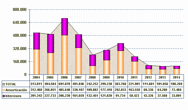Fuente: Dirección Distrital de Crédito Público Con el propósito de mejorar el perfil de la deuda del Distrito Capital frente a los principales riesgos inherentes, especialmente la concentración de vencimientos, desde el año 2003 se vienen realizando operaciones de cobertura y de sustitución de deuda. Es así como, entre otras, se llevó a cabo una operación de manejo sobre los compromisos del Crédito CAF-1880, consistente en un Cross Currency Swap, con el cual el Distrito Capital realizó la cobertura de por un monto de US$ 17 millones con Credit Suisse First Boston (CSFB). Así mismo, se suscribió una operación de manejo de deuda con Bear Stearns, consistente en un Cross Currency Swap, para la cobertura de tasa de cambio sobre las amortizaciones por US$ 19.9 millones del Crédito BIRF-4021. Durante la vigencia 2004 se diseñaron y estructuraron dos operaciones de manejo de deuda, sobre los compromisos del créditos externo CAF-1880 por US$87.6 millones y sobre los Bonos Externos con vencimiento en diciembre de 2006 por US$99.3 millones, mejorando aún más el perfil del servicio de la deuda y reduciendo la exposición del Distrito Capital al riesgo cambiario y de tasa de interés de sus pasivos denominados en dólares. La primera de las operaciones suscritas durante la vigencia 2004 se ejecutó el pasado 10 de junio entre el Distrito Capital, CSFB y Citibank, y consistió en una cobertura de tasa de cambio sobre las amortizaciones en dólares entre mayo de 2005 y mayo de 2011 del crédito CAF-1880. Igualmente, el 24 de junio se suscribió un Cross Currency Swap sobre los compromisos derivados de la Emisión de Bonos Externa con vencimiento en diciembre 12 de 2006. Las operaciones de cobertura cambiaria realizadas por la SHD le han permitido fijar el costo de devaluación del 65% de la deuda externa, por medio de la tasa de devaluación implícita en las operaciones de cobertura, la cual se encuentran alrededor del 7% anual. Estos niveles de devaluación son inferiores al promedio observado en los últimos años del 14.73%. Las operaciones de cobertura fueron realizadas para un plazo de 8 años lo que asegura la protección de las finanzas del distrito frente al riesgo cambiario en el largo plazo. De esta forma, la gestión sobre el portafolio realizada en los años 2003 y 2004, han disminuido el presupuesto de servicio de deuda de los próximos años. Específicamente para el año 2006 la diferencia entre la tasa de presupuestación del servicio de la deuda y la tasa obtenida en las operaciones de cobertura, genera un menor valor de servicio de deuda para este año aproximado de $91 mil millones de pesos. Gráfico 3. Proyección de del Servicio de la Deuda 2004 - 2014 Incluye Operaciones de Cobertura Millones de pesos
