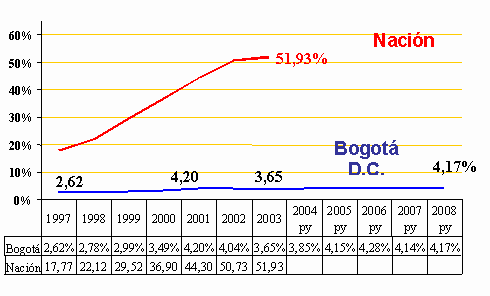 Fuente: Dirección Distrital de Crédito Público D. Consideraciones finales. Señores Concejales: Por lo antes expuesto, y dada la urgente necesidad que tiene el Distrito de contar con un cupo de endeudamiento por lo menos suficiente para gestionar los recursos necesarios que le permitan llevar a cabo los programas de inversión contemplados en el Plan de Desarrollo "Bogotá Sin Indiferencia. Un compromiso social contra la pobreza y la exclusión", los cuales redundarán en el mejoramiento de la calidad de vida de los bogotanos, nos permitimos poner a consideración del H. Concejo de Bogotá el Proyecto de Acuerdo "Por el cual se amplía el cupo de endeudamiento autorizado mediante los Acuerdos No. 08 de 1998, No. 41 de 2001 y No. 112 de 2003". Estaremos atentos a suministrar al H. Concejo de Bogotá D.C. la información adicional que solicite, con el objeto que cuente con todos los elementos de juicio necesarios para el análisis del Proyecto de Acuerdo sometido a consideración y de los demás aspectos de la política fiscal del Distrito. De los Honorables Concejales,
