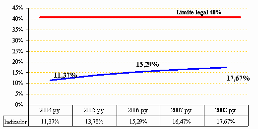 El Distrito Capital ha mantenido sus indicadores por debajo de los límites permitidos. Así mismo, con los recursos del crédito a contratar en las vigencias 2004-2008, los indicadores establecidos por la Ley 358 de 1997 mantendrán niveles sostenibles, como se observa en los Gráficos 7 y 8. El Gráfico 7 muestra la relación intereses de la deuda sobre ahorro operacional hasta ubicarse en el 2008 en un 17.67%, siendo el límite legal para este indicador del 40%. Gráfico 7. Proyección Intereses/Ahorro Operacional 2004-2008