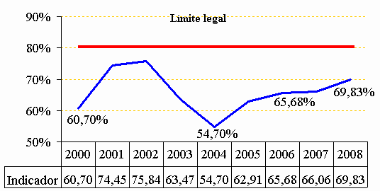 Fuente: SHD, Dirección Distrital de Crédito Público El Grafico 8 muestra por su parte que el indicador el comportamiento del saldo de la deuda el cual, históricamente, se ha conservado en un nivel inferior del 80%.Es así, que de saldo de la deuda en el año 1998 fue de 48,19% hasta alcanzar un 63,47% en el año 2003. En igual forma del 54,70% en el año 2004, una vez contempladas las variaciones que puedan sufrir con el nuevo endeudamiento en el año 2008 alcanzará nivles del 69,83%. Gráfico 8. Proyección Saldo de la Deuda / Ingresos Corrientes 2002-2008