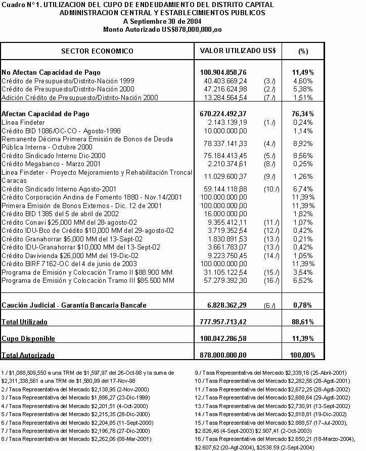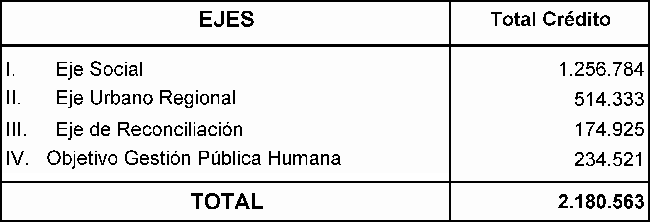 NOTA : Para efectos del monto afectado del cupo de endeudamiento se utilizaron las Tasas Representativas del Mercado a la fecha de emisión. En consecuencia, la ampliación del cupo de endeudamiento permitirá al Distrito ejecutar el plan de endeudamiento hasta el 2008. Tal y como se describe en el presente documento sobre el Plan de Endeudamiento del Distrito Capital, los instrumentos previstos para el financiamiento en este periodo, son principalmente el Programa de Emisión y Colocación de Bogotá, D.C. (Bonos Internos) - PEC - y las operaciones de crédito con la Banca Multilateral. De todas formas, el plan contempla además, la celebración de operaciones de financiamiento externo (bonos o créditos sindicados) y operaciones con el sector financiero local. La ampliación del cupo de endeudamiento es condición previa y necesaria para obtener las autorizaciones de carácter legal y técnico de la ampliación del Programa de Emisión y Colocación de Bonos Internos y de los créditos multilaterales. Por ejemplo, para acceder a los recursos de crédito de la Banca Multilateral debe tenerse en cuenta que estos recursos son otorgados por estas instituciones dentro del marco de programación plurianual, los cuales para los próximos años se establecerán durante el 2004, tal y conforme a los lineamientos del Documento CONPES 3119 de junio de 2001, que establece la estrategia general de endeudamiento de la Nación y las entidades públicas con la banca multilateral y bilateral. Además, teniendo en cuenta que una buena parte del plan de endeudamiento se ejecutará con empréstitos y operaciones externas, es necesario que la ampliación del cupo de endeudamiento sea denominado en dólares de los EUA o su equivalente en otras monedas, para garantizar que a la hora de realizar las operaciones, éstas se ajusten a las necesidades de recursos estimadas en la estrategia de financiamiento. B. RESEÑA DEL PLAN DE DESARROLLO "BOGOTÁ SIN INDIFERENCIA, UN COMPROMISO SOCIAL CONTRA LA POBREZA Y LA EXCLUSIÓN" En los años recientes, las administraciones de la ciudad se han ocupado, desde distintas perspectivas y con diferentes énfasis, de la mejora en la calidad de vida de los ciudadanos y ciudadanas de la capital. Particular atención han merecido las obras de infraestructura, el sistema de transporte masivo, el espacio público, la convivencia y participación ciudadana y la ampliación de cobertura en salud, educación y servicios básicos. De igual forma, la cultura, la recreación, el medio ambiente y la eficiencia institucional han merecido especial atención. Aunque estas inversiones han convertido a Bogotá en una ciudad moderna y pujante, los logros alcanzados deben ser complementados con más inversiones que hagan de Bogotá una ciudad con capital productivo en lo económico, incluyente en lo social y participativo en lo político. Se hace necesario entonces, reorientar los esfuerzos y crear iniciativas en donde se integren la ciudad moderna y la ciudad humana, donde las políticas que han generado la modernización de Bogotá se mantengan. Igualmente, se tendrá un enfoque en la ciudad humana, que concibe el desarrollo como la plena vigencia de los derechos humanos en una perspectiva integral. Para responder a todas estas exigencias, el Concejo de Bogotá, mediante Acuerdo No. 119 del 29 de mayo de 2004, aprobó el Plan de Desarrollo Económico, Social y de Obras Públicas para Bogotá D.C. 2004-2008 "Bogotá Sin Indiferencia. Un compromiso social contra la pobreza y la exclusión", el cual gira en torno a tres Ejes estructurales: