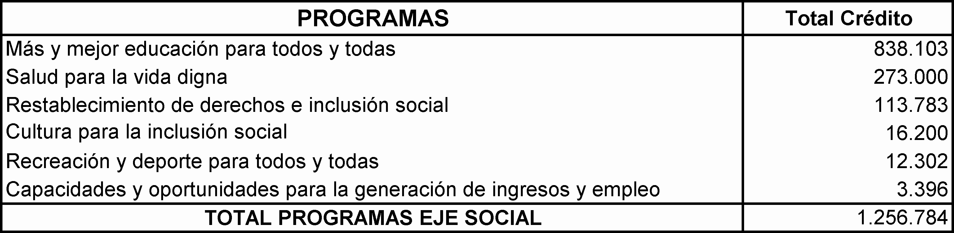 Fuente: SHD, Dirección Distrital de Presupuesto. Al analizar el destino de los recursos del crédito dentro de los sectores expuestos con anterioridad, se aprecia que una gran porción del endeudamiento será destinado a educación, bienestar social y salud. A continuación se exponen los principales programas enmarcados dentro de los Ejes del Plan de Desarrollo a ser financiados parcialmente con recursos del crédito: Eje Social Cuadro 10. Programas a financiar con Recursos del Crédito Eje Social (Millones de Pesos)