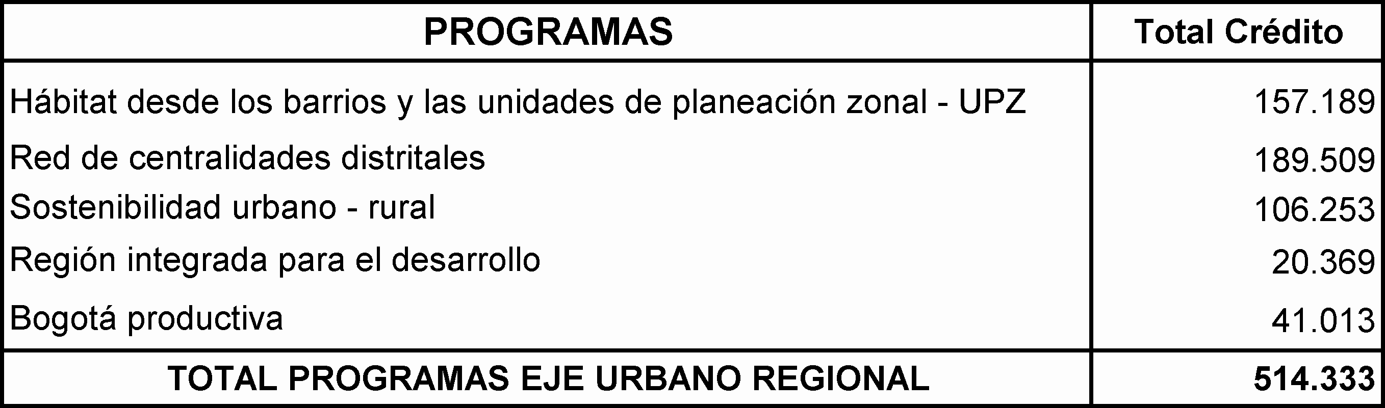 Fuente: SHD . Dirección Distrital de Presupuesto. Eje Urbano Regional Cuadro 11. Programas a financiar con Recursos del Crédito Eje Urbano Regional (Millones de Pesos)