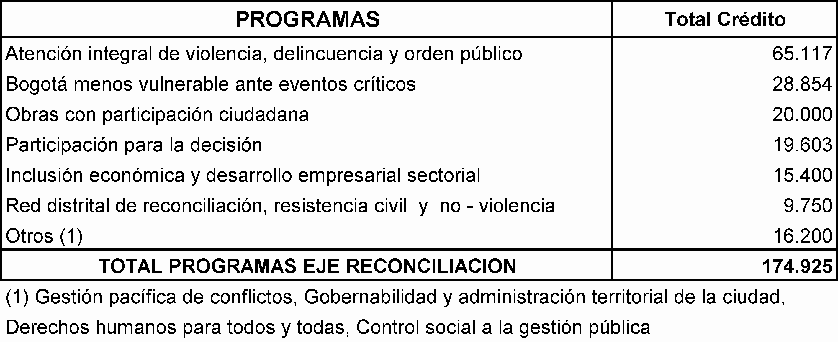 Fuente: SHD . Dirección Distrital de Presupuesto. Eje de Reconciliación Cuadro 12. Programas a financiar con Recursos del Crédito Eje de Reconciliación (Millones de Pesos)