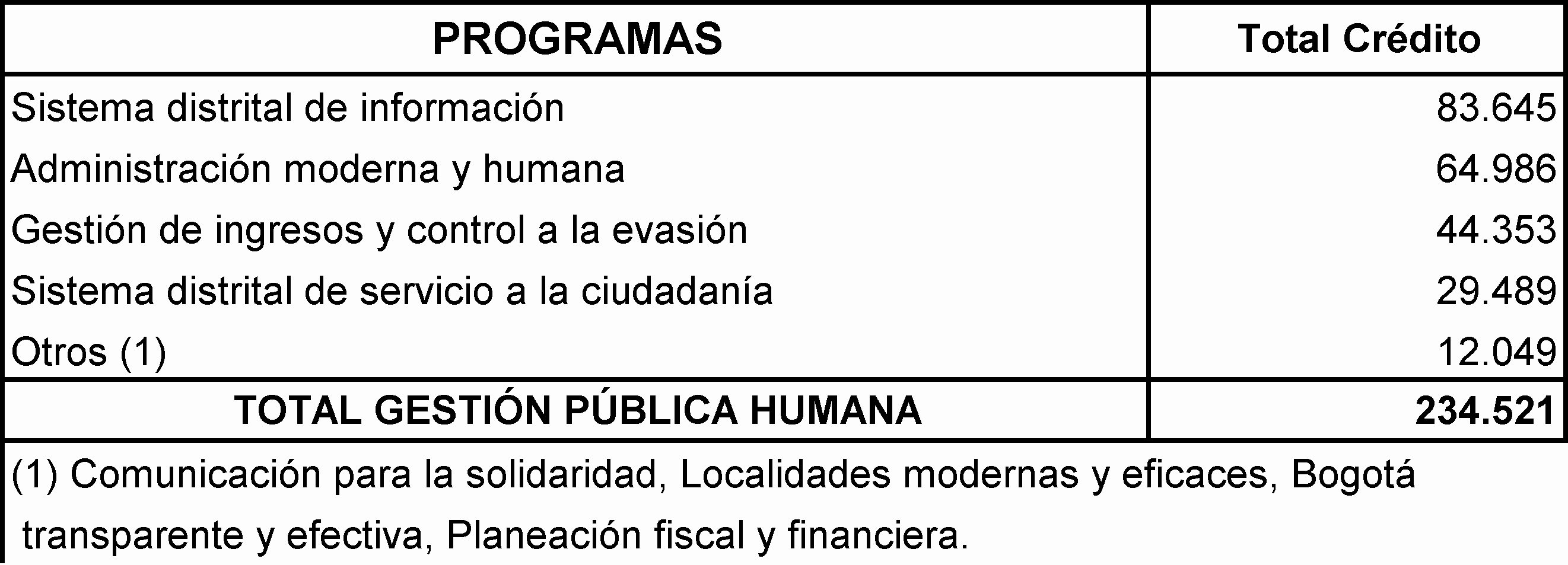 Fuente: SHD . Dirección Distrital de Presupuesto. Objetivo Gestión Pública Humana Cuadro 13. Programas a financiar con Recursos del Crédito Objetivo Gestión Pública Humana (Millones de Pesos)