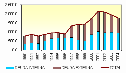 Fuente: SHD . Dirección Distrital de Presupuesto. CAPITULO II ASPECTOS DEL ENDEUDAMIENTO DEL DISTRITO CAPITAL A. PERFIL DE LA DEUDA DEL DISTRITO CAPITAL - 1990 - 2004 El endeudamiento del Distrito Capital en el período 1990 . 2001 tuvo un crecimiento del 10,8% real. A partir del año 2002 la tendencia ha sido decreciente. En el período 1994 .1997 el saldo de la deuda se incrementó en $386.9 mil millones; entre 1997 y el 2000 aumentó en otros $395.7 mil millones y entre el 2000 y el 2004 se presenta una disminución de cerca de $353 mil millones, debido a las amortizaciones del crédito sindicado en moneda externa y vencimiento de Décima Emisión Bonos 1997 por $70 mil millones. Ver cuadro 14 y Gráfico 1. Cuadro 14. Evolución de la Duda 1990 . 2004*