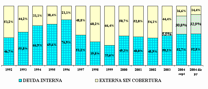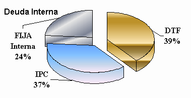 Fuente: Dirección Distrital de Crédito Público Adicionalmente, en el comportamiento del endeudamiento para el periodo 2001-2003, se destaca el esfuerzo realizado por la Administración Distrital en diversificar sus fuentes de endeudamiento y en crear estructuras de financiamiento más sofisticadas, que le han permitido obtener recursos de crédito mediante instrumentos de deuda que por un lado garanticen el financiamiento de las inversiones y por el otro preserven la capacidad de pago de Bogotá D.C. La administración del portafolio de la deuda del Distrito Capital se realiza en la actualidad bajo lineamientos técnicos de gestión financiera de administración de riesgos, en un contexto de intercambio entre costo y riesgo. Bogotá D.C. presenta un endeudamiento diversificado. En efecto, ha obtenido recursos provenientes de la banca doméstica, del mercado local de capitales mediante la emisión de bonos de deuda pública interna, de la banca internacional, del mercado internacional de capitales con la emisión de bonos externos, de la Banca Multilateral y de créditos de gobiernos. Esta diversificación de fuentes atenúa el nivel de riesgo de refinanciación y permite mejorar las condiciones de negociación de las operaciones de crédito público. En el periodo comprendido entre 1992 y 1996 el endeudamiento del Distrito Capital fue principalmente interno. En el año 1997 dicha tendencia cambió como producto de la contratación del Crédito Sindicado Externo liderado por Société Générale. A partir del año 2000, la participación de la deuda interna ha presentado niveles entre el 45% y el 50% del endeudamiento total, y con las operaciones de cobertura la composición se cambia a un 85,6% de deuda interna más externa cubierta y 14,4% externa sin cobertura, tal y como se aprecia en el siguiente gráfico 2. Gráfico 2. Evolución de la composición de la deuda por monedas 1992 . 2003