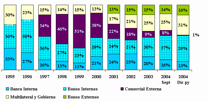 Fuente: Dirección Distrital de Crédito Público A principios de la década de los noventa el endeudamiento del Distrito Capital presentaba una marcada orientación a las fuentes de banca multilateral y a las emisiones de bonos internas. En el Gráfico 4 se aprecia la evolución de las fuentes de financiamiento en el periodo 1992-2003 Gráfico 4. Evolución de las Fuentes de Financiamiento