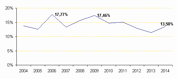 Fuente: Dirección Distrital de Crédito Público Con el propósito de mejorar el perfil de la deuda del Distrito Capital frente a los principales riesgos inherentes, especialmente la concentración de vencimientos, desde el año 2002 se viene realizando operaciones de cobertura y de sustitución de deuda. Es así como, entre otras, se llevó a cabo una operación de manejo sobre los compromisos del Crédito CAF-1880, consistente en un Cross Currency Swap, con el cual el Distrito Capital realizó la cobertura de por un monto de US$ 17 millones con Credit Suisse First Boston (CSFB). Así mismo, se suscribió una operación de manejo de deuda con Bear Stearns, consistente en un Cross Currency Swap, para la cobertura de tasa de cambio sobre las amortizaciones por US$ 19.9 millones del Crédito BIRF-4021. Durante la vigencia 2004 se diseñaron y estructuraron dos operaciones de manejo de deuda, sobre los compromisos del créditos externo CAF-1880 por US$87.6 millones y sobre los Bonos Externos con vencimiento en diciembre de 2006 por US$99.3 millones, mejorando aún más el perfil del servicio de la deuda y reduciendo la exposición del Distrito Capital al riesgo cambiario y de tasa de interés de sus pasivos denominados en dólares. La primera de las operaciones suscritas durante la vigencia 2004 se ejecutó el pasado 10 de junio entre el Distrito Capital, CSFB y Citibank, y consistió en una cobertura de tasa de cambio sobre las amortizaciones en dólares entre mayo de 2005 y mayo de 2011 del crédito CAF-1880. Igualmente, el 24 de junio se suscribió un Cross Currency Swap sobre los compromisos derivados de la Emisión de Bonos Externa con vencimiento en diciembre 12 de 2006. Las operaciones de cobertura cambiaria realizadas por la SHD le han permitido fijar el costo de devaluación del 65% de la deuda externa, por medio de la tasa de devaluación implícita en las operaciones de cobertura, la cual se encuentran alrededor del 7% anual. Estos niveles de devaluación son inferiores al promedio observado en los últimos años del 14.73%. Las operaciones de cobertura fueron realizadas para un plazo de 8 años lo que asegura la protección de las finanzas del distrito frente al riesgo cambiario en el largo plazo. De esta forma, la gestión sobre el portafolio realizada en los años 2003 y 2004, han disminuido el presupuesto de servicio de deuda de los próximos años. Específicamente para el año 2006 la diferencia entre la tasa de presupuestación del servicio de la deuda y la tasa obtenida en las operaciones de cobertura, genera un menor valor de servicio de deuda para este año aproximado de $91 mil millones de pesos. Tal y como se aprecia en el Gráfico 7, en el escenario estimado para el Marco de Mediano Plazo, el servicio de la deuda en ninguno de los años estimados supera en un 20% los ingresos totales. Es importante resaltar que el servicio de la deuda incluye no solo el pago de intereses y comisiones, sino también el pago de principal. Gráfico 7. Servicio de la Deuda como % de los Ingresos Totales