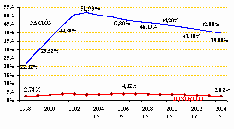 Fuente: Dirección Distrital de Crédito Público La proyección de los indicadores al finalizar el año 2004 es de 11,33% (Intereses / Ahorro Operacional) y de 49.93% (Saldo de la Deuda / Ingresos Corrientes). Estos indicadores se muestran favorables debido a la revaluación que se presentó durante la vigencia y la recuperación de los ingresos corrientes durante la vigencia 2003. Finalmente, otro indicador importante para analizar el endeudamiento del Distrito Capital es el de Saldo de la Deuda / PIB, el cual, como producto del bajo crecimiento de la economía en los últimos cinco años aumentó, llegando a niveles del 4.2% en el año 2001, pero mostrando a partir de dicho año una tendencia decreciente. En el Gráfico 12 se presenta un comparativo del indicador saldo de la deuda sobre PIB, tanto a nivel de la Nación como el del Distrito Capital, en el que se puede apreciar la estabilidad en el manejo del endeudamiento de la ciudad. Gráfico 12 . Proyección del Indicador de Saldo de la Deuda / PIB
