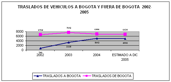 Como se observa en la gráfica Nº 1 en el período 2002-2005, 14.086 propietarios de vehículos automotores trasladaron el registro de sus vehículos a Bogotá, mientras que durante el mismo período, 28.142 vehículos automotores que inicialmente tenían su registro en Bogotá, trasladaron su registro a otros entes territoriales, es decir en el citado período, 14.056 vehículos dejaron de aportar recursos por concepto de impuesto de vehículos automotores, lo que sin lugar a dudas se constituye como una pérdida significativa de recursos económicos.