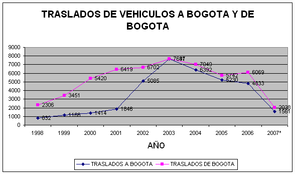 *Según Presupuesto 2007 Ello significa que esta cifra ($52 mil millones) representa un 25% del valor que se proyecta recaudar para el año 2.007 por este concepto, lo cual recobra gran importancia si tenemos en cuenta otro elemento adicional a este, cual es el que según proyecciones preliminares de la Administración, la instalación de peajes en las diferentes salidas de la ciudad (6) le representaría a la ciudad una cifra cercana a los $83 mil millones al año. Es decir, que una estrategia, como la que se propone mediante este Proyecto de Acuerdo, encaminada a incentivar el traslado de los vehículos, que normalmente circulan las diferentes vías de la ciudad y que contribuyen con el deterioro de éstas, contribuiría con el 62.65% de los recursos que por concepto de peajes espera recaudar la Administración. Con esta iniciativa se pretende reducir el número de vehículos automotores que tributan en otros entes territoriales y que sin embargo, residen y circulan en la ciudad, motivando a los propietarios de vehículos no matriculados en Bogotá a aportarle a ésta ciudad y minimizar en parte, el desequilibrio y el impacto negativo en la malla vial. Indudablemente para el éxito de lo que se propone en este Proyecto, en caso de ser aprobado, se deberá desarrollar una estrategia de comunicaciones con los concesionarios y con los ciudadanos a fin de dar a conocer los alcances de este Acuerdo, no solo desde el punto de vista de los recursos que se generarían adicionalmente, sino también en lo relacionado con el estado de la malla vial. Esta iniciativa es de gran trascendencia para la Ciudad, y si bien es cierto que el Decreto Distrital 352 de 2.002 "Por el cual se compila y actualiza la normativa sustantiva tributaria vigente, incluyendo las modificaciones generadas por la aplicación de nuevas normas nacionales que se deban aplicar a los tributos del Distrito Capital, y las generadas por acuerdos del orden distrital", en su Artículo 68 establece que quienes matriculen sus vehículos nuevos o trasladen por primera vez su cuenta a Bogotá, Distrito Capital, gozarán de un descuento del 50% del impuesto sobre vehículos automotores correspondiente al año siguiente a aquel en que sea matriculado el vehículo o radicado el traslado de su cuenta, vemos con preocupación que dicha norma no ha surtido sus efectos esperados, basta con ello, mirar el numero de vehículos que se han trasladado a la ciudad. Se desconocen los motivos por los cuales no se ha procedido por parte de los propietarios a hacer el traslado de la cuenta respectiva y seguramente el beneficio otorgado en el porcentaje determinado no ha motivado a los mismos a así hacerlo y por eso considero que esta Corporación debe tomar medidas que permitan estimular la matrícula inicial y el traslado de la misma de otros entes territoriales a Bogotá, toda vez que existen factores como el traslado de vehículos matriculados en la Ciudad a otras ciudades, que afectan de manera directa nuestras finanzas, factores estos que no han sidos tenidos en cuenta, que han pasados desapercibidos para las diversas administraciones, tal como podemos observar en el siguiente análisis gráfico: