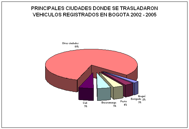 Gráfica Nº 1 Fuente: Cálculos Propios con información SETT Como se observa en la gráfica Nº 1 en el período 1998 - 2007 (Mayo 8), 36.000 propietarios de vehículos automotores trasladaron el registro de sus vehículos a Bogotá, mientras que durante el mismo período, 52.883 vehículos automotores que inicialmente tenían su registro en Bogotá, trasladaron su registro a otros entes territoriales, es decir en el citado período, 16.883 vehículos dejaron de aportar recursos por concepto de impuesto de vehículos automotores, lo que sin lugar a dudas se constituye como una pérdida significativa de recursos económicos. Esta fuga de recursos tiene como principales destinos las ciudades de Cali y Bucaramanga con un 6% de los traslados, Pasto con el 4%, Buga con el 3% e Ibagué con un 2%; tal como se puede apreciar en la gráfica Nº 2.
