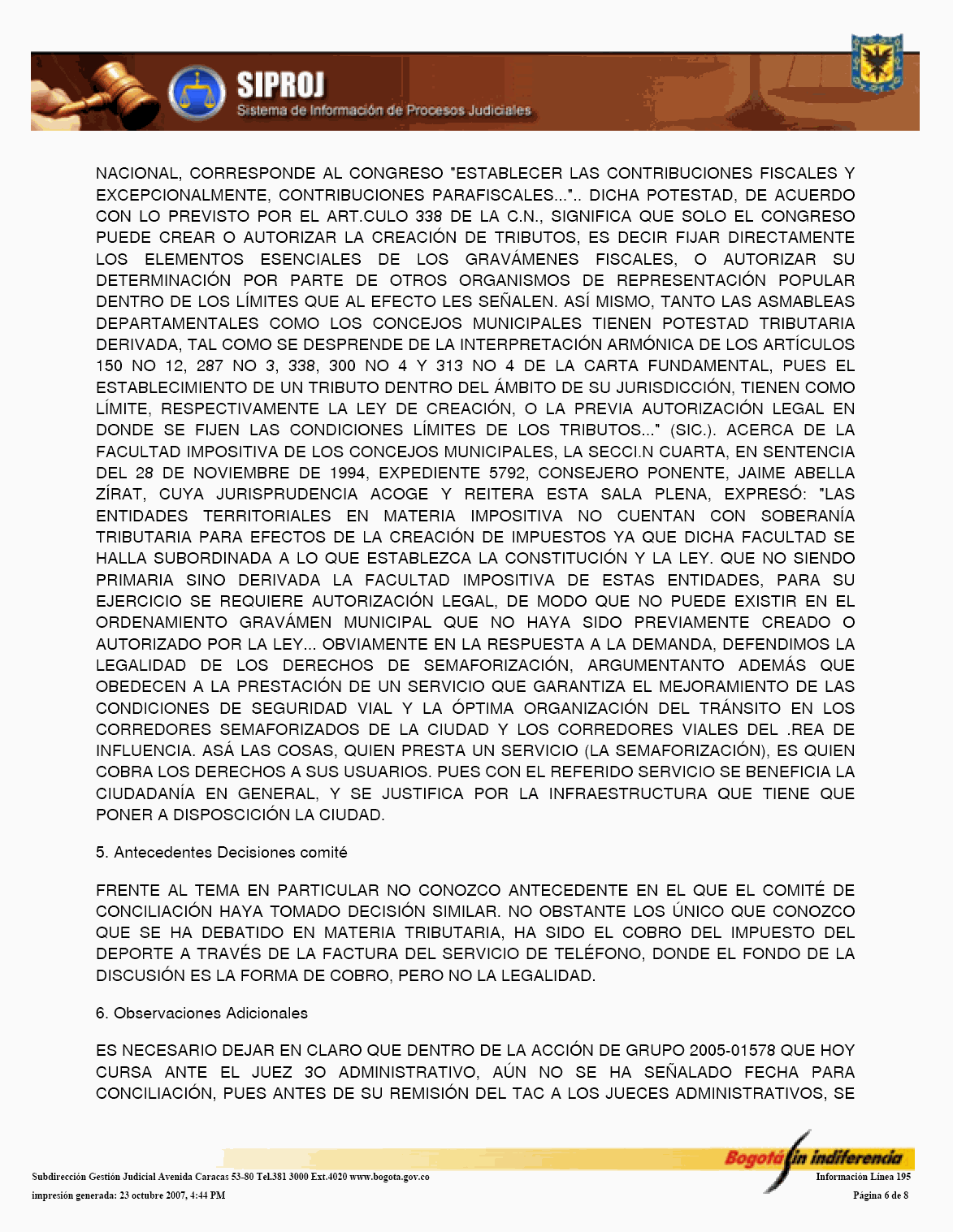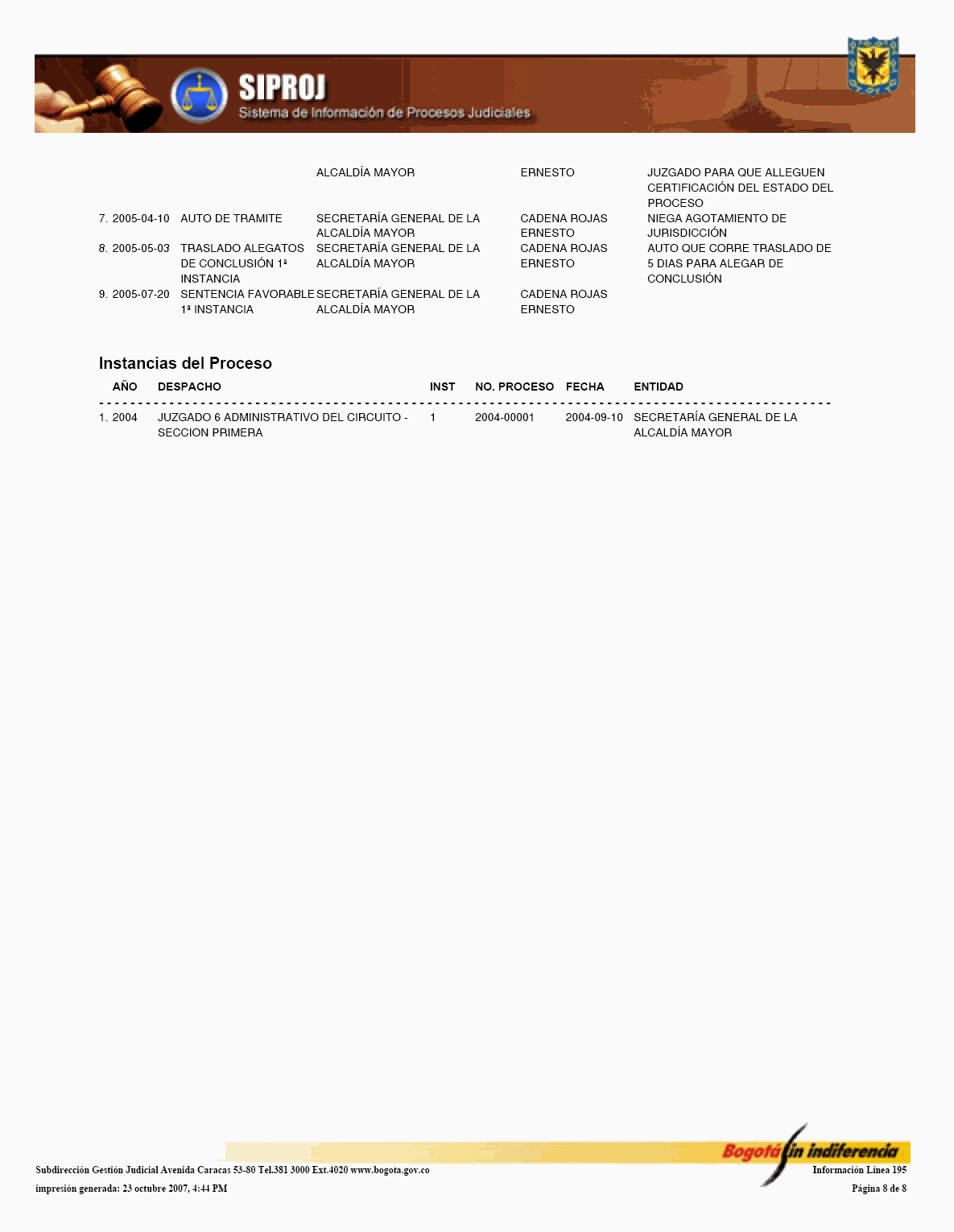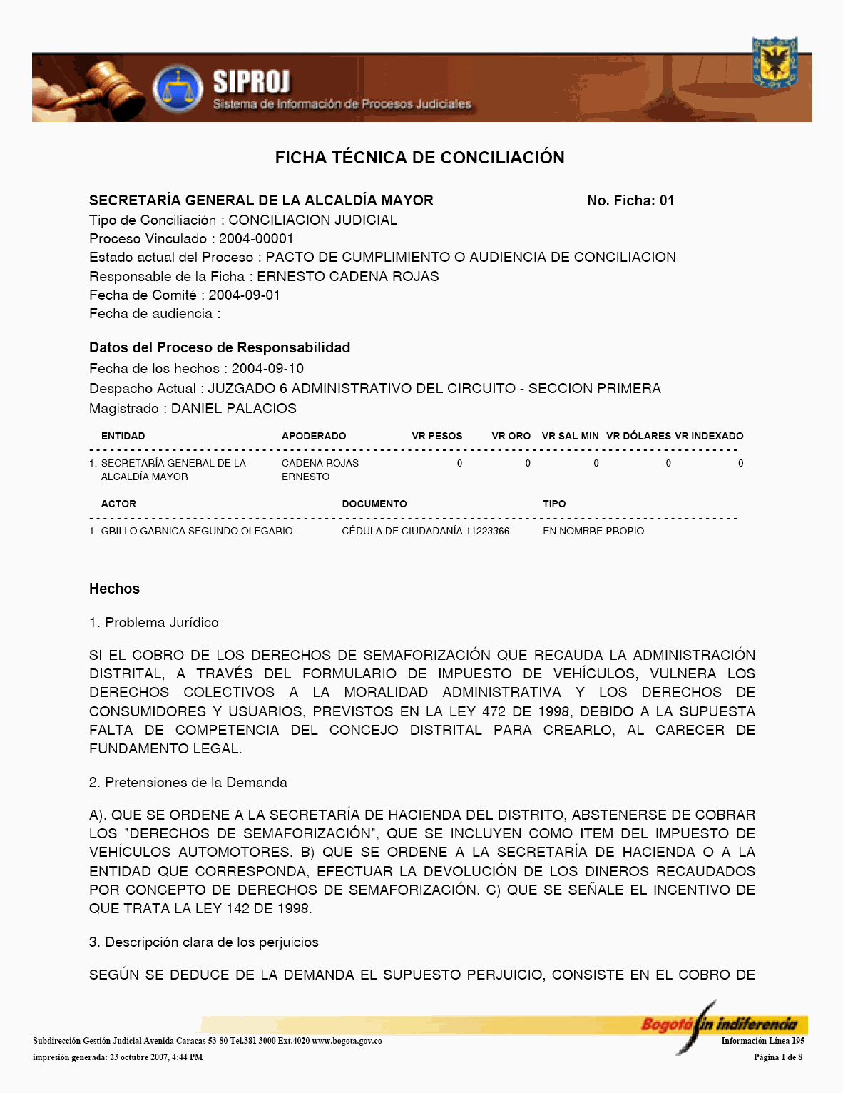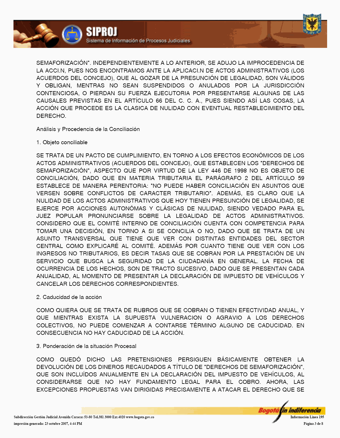 El Sistema de Información de Procesos Judiciales -SIPROJWEB Bogotá-, como Sistema en red (on line) de gestión, implementado a través de una aplicación WEB, ha permitido a las entidades y organismos que hacen parte de la estructura administrativa del Distrito Capital: Crear, incorporar, organizar y buscar la información relacionada con los procesos contenciosos, constitucionales, laborales, civiles, penales, tutelas y conciliaciones entre otros, convirtiéndose en una herramienta de trabajo que facilita la gestión y la prevención del daño en temas jurídicos, en los que hace parte el Distrito Capital. En este orden de ideas, la Administración considera pertinente, frente al Módulo de Conciliación, expedir algunas instrucciones a los organismos y entidades, a fin de facilitar el manejo y operatividad de dicha herramienta, para el efecto se permite establecer las siguientes directrices: 1. El Jefe Jurídico de la entidad u organismo, por medio de oficio dirigido al Subdirector de Gestión Judicial de la Secretaría General de la Alcaldía Mayor de Bogotá D.C., deberá solicitar la creación del usuario con la asignación del perfil y clave correspondiente para el manejo del Módulo. 2. El jefe jurídico deberá informar las novedades relacionadas con la vinculación y desvinculación de los servidores públicos y/o contratistas, así como solicitar las correspondientes capacitaciones en los diferentes Módulos del SIPROJWEB. 3. Para facilitar la labor de los Secretarios Técnicos de los Comités de Conciliación, es necesario que alleguen a la Subdirección de Gestión Judicial, el nombre del actual Secretario Técnico junto con la dirección electrónica y teléfono de contacto correspondiente para ser incorporado en el aplicativo y habilitarle el privilegio para modificar las fichas técnicas, tanto de Conciliación como de Repetición, garantizándole la posibilidad de realizar la programación oportuna de los comités a través del módulo de mantenimiento, así como el correcto y oportuno diligenciamiento de la información. 4. El apoderado o quien incorpore o actualice la información en SIPROJWEB frente a procesos terminados, deberá señalar la fecha de ejecutoria del fallo, en la medida que ésta la tomará el Sistema para efectos del cálculo de la caducidad para iniciar la Acción de Repetición. 5. Módulo Conciliación Prejudicial. En este módulo se debe ingresar la información relacionada con este tipo de conciliación. Teniendo en cuenta que por no tratarse de procesos judiciales, el número para la radicación varía, razón por la cual, en la casilla marcada en SIPROJWEB como "No. CDI" se colocará la radicación de la entidad ante la que se va a surtir la Conciliación o la radicación con el número asignado en la oficina de correspondencia, o en su defecto, el número interno de reparto al interior de la entidad. Las Conciliaciones Prejudiciales deben actualizarse de la misma manera que los procesos judiciales, con el fin de tener en el sistema la información real y oportuna para la entidad. De no encontrarse actualizada dicha información, y en el evento de encontrarse terminados estos asuntos, el sistema validará la información como activa. 6. Diligenciamiento de las Fichas de Conciliación Prejudicial. Para la elaboración de fichas de conciliación prejudicial es prerrequisito radicar previamente la información del proceso en el módulo de prejudiciales. Las fichas tanto de Conciliación, como de Repetición, deberán ser tramitadas en su totalidad por el abogado a cargo del proceso y remitidas previamente al Secretario Técnico a través del aplicativo en SIPROJ. 7. Comité de Conciliación. Como parte de esta directiva, se anexa el formato único de Acta de Conciliación, que deberá ser utilizado por la entidades u organismos distritales en el cual se especifica entre otros ítems, el tipo de proceso, las partes, el número del expediente que se somete a consideración del Comité, al igual que la decisión adoptada por el mismo frente al tema. Una vez aprobada el Acta, deberá remitirse fotocopia de la misma con medio magnético a la Subdirección de Gestión Judicial dentro de los 30 días siguientes, para su correspondiente protocolización, tematización e ingreso a los Sistemas de Información Jurídicos. Por lo anterior y de conformidad con la Directiva Nº 003 del 28 de junio de 2006 del Alcalde Mayor donde se oficializa la entrada en funcionamiento de este Módulo, solicito se tengan en cuenta las anteriores recomendaciones en aras de garantizar la seguridad del Sistema, la confiabilidad en la información y la oportuna alimentación del mismo, por parte de los responsables en cada una de las entidades y organismos. Cordialmente, ENRIQUE BORDA VILLEGAS Secretario General Alcaldía Mayor de Bogotá D.C. FORMATO ACTA DE COMITÉ 1. ENCABEZADO: Debe contener: Número Consecutivo del Acta, seguido de la fecha y el nombre de la entidad y/o organismo a la cual corresponde el acta. Todo en NEGRILLA, CENTRADO.