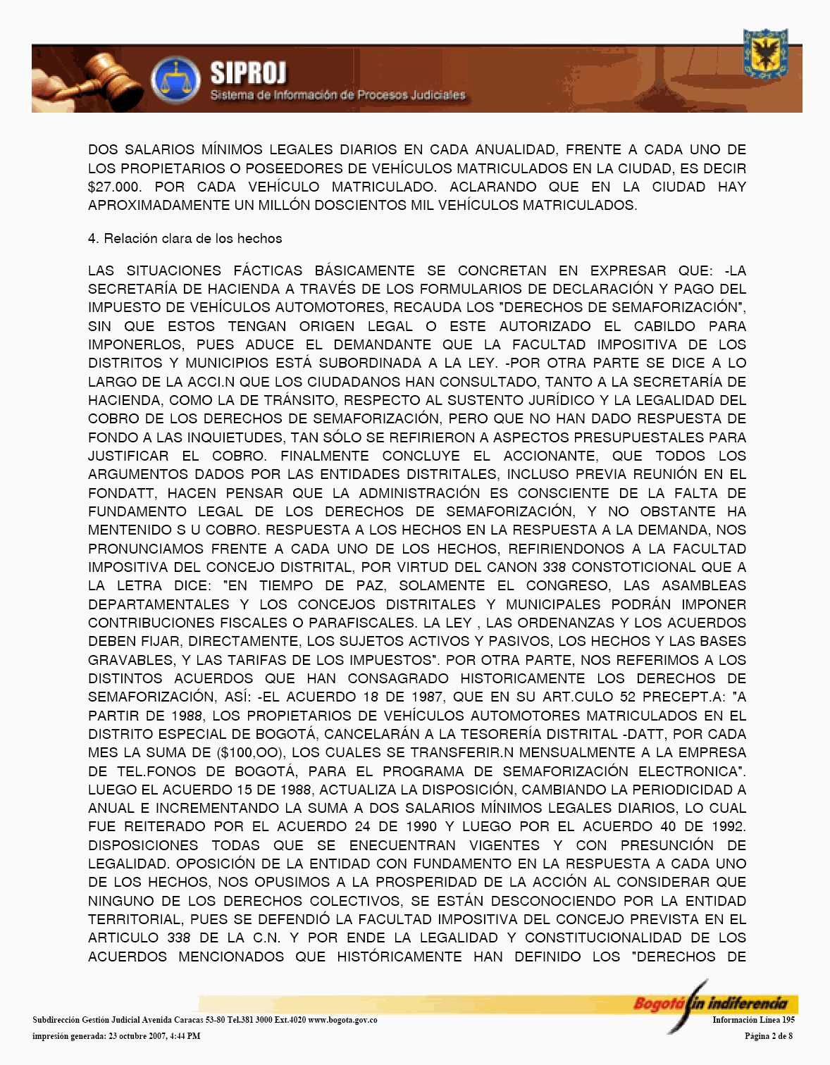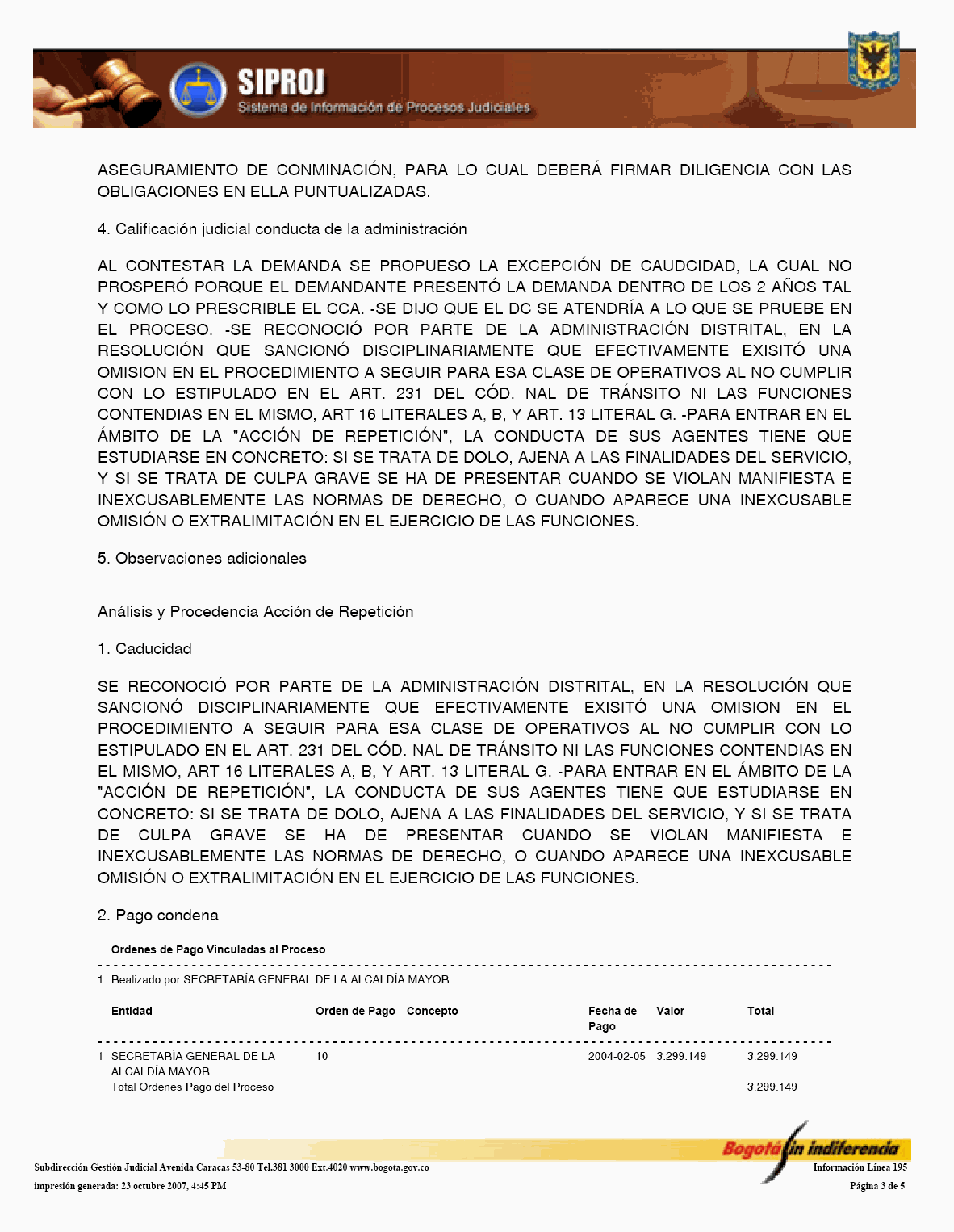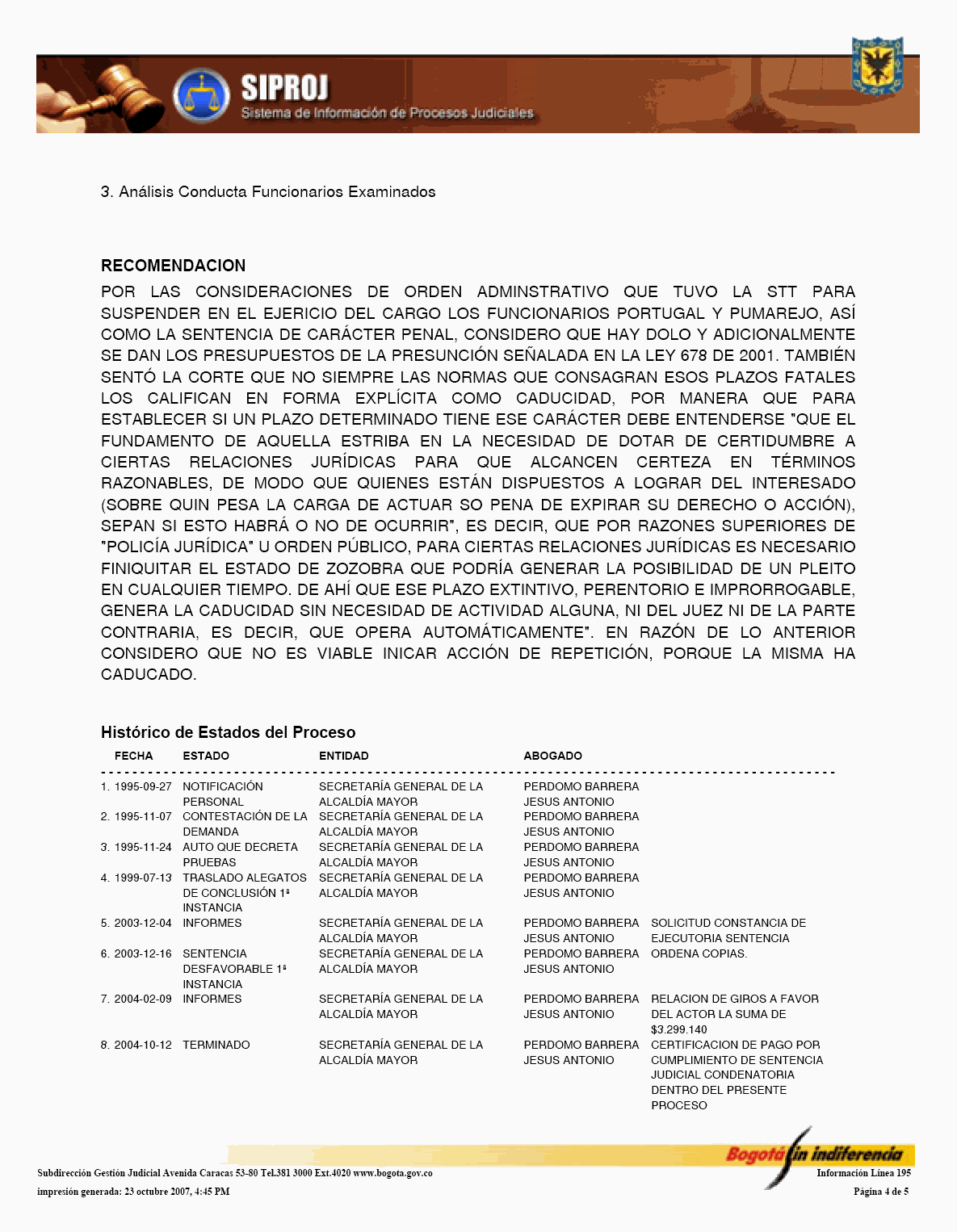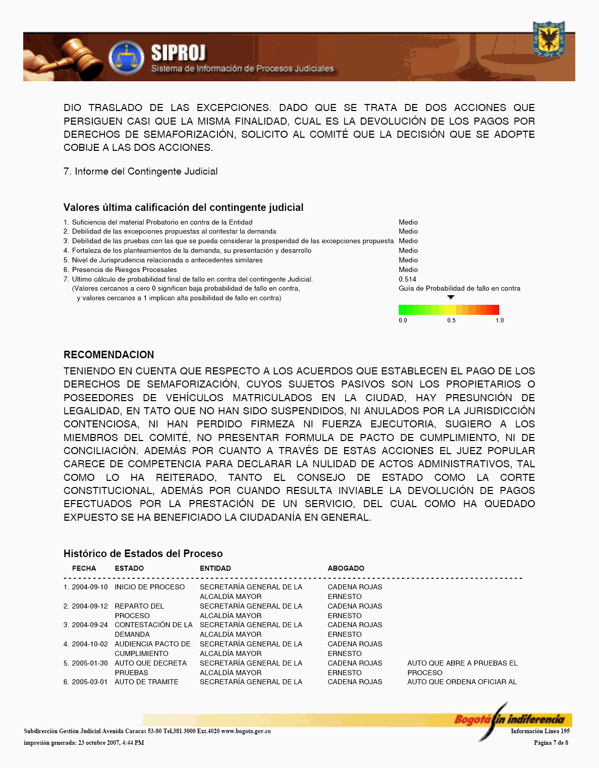 El Sistema de Información de Procesos Judiciales -SIPROJWEB Bogotá-, como Sistema en red (on line) de gestión, implementado a través de una aplicación WEB, ha permitido a las entidades y organismos que hacen parte de la estructura administrativa del Distrito Capital: Crear, incorporar, organizar y buscar la información relacionada con los procesos contenciosos, constitucionales, laborales, civiles, penales, tutelas y conciliaciones entre otros, convirtiéndose en una herramienta de trabajo que facilita la gestión y la prevención del daño en temas jurídicos, en los que hace parte el Distrito Capital. En este orden de ideas, la Administración considera pertinente, frente al Módulo de Conciliación, expedir algunas instrucciones a los organismos y entidades, a fin de facilitar el manejo y operatividad de dicha herramienta, para el efecto se permite establecer las siguientes directrices: 1. El Jefe Jurídico de la entidad u organismo, por medio de oficio dirigido al Subdirector de Gestión Judicial de la Secretaría General de la Alcaldía Mayor de Bogotá D.C., deberá solicitar la creación del usuario con la asignación del perfil y clave correspondiente para el manejo del Módulo. 2. El jefe jurídico deberá informar las novedades relacionadas con la vinculación y desvinculación de los servidores públicos y/o contratistas, así como solicitar las correspondientes capacitaciones en los diferentes Módulos del SIPROJWEB. 3. Para facilitar la labor de los Secretarios Técnicos de los Comités de Conciliación, es necesario que alleguen a la Subdirección de Gestión Judicial, el nombre del actual Secretario Técnico junto con la dirección electrónica y teléfono de contacto correspondiente para ser incorporado en el aplicativo y habilitarle el privilegio para modificar las fichas técnicas, tanto de Conciliación como de Repetición, garantizándole la posibilidad de realizar la programación oportuna de los comités a través del módulo de mantenimiento, así como el correcto y oportuno diligenciamiento de la información. 4. El apoderado o quien incorpore o actualice la información en SIPROJWEB frente a procesos terminados, deberá señalar la fecha de ejecutoria del fallo, en la medida que ésta la tomará el Sistema para efectos del cálculo de la caducidad para iniciar la Acción de Repetición. 5. Módulo Conciliación Prejudicial. En este módulo se debe ingresar la información relacionada con este tipo de conciliación. Teniendo en cuenta que por no tratarse de procesos judiciales, el número para la radicación varía, razón por la cual, en la casilla marcada en SIPROJWEB como "No. CDI" se colocará la radicación de la entidad ante la que se va a surtir la Conciliación o la radicación con el número asignado en la oficina de correspondencia, o en su defecto, el número interno de reparto al interior de la entidad. Las Conciliaciones Prejudiciales deben actualizarse de la misma manera que los procesos judiciales, con el fin de tener en el sistema la información real y oportuna para la entidad. De no encontrarse actualizada dicha información, y en el evento de encontrarse terminados estos asuntos, el sistema validará la información como activa. 6. Diligenciamiento de las Fichas de Conciliación Prejudicial. Para la elaboración de fichas de conciliación prejudicial es prerrequisito radicar previamente la información del proceso en el módulo de prejudiciales. Las fichas tanto de Conciliación, como de Repetición, deberán ser tramitadas en su totalidad por el abogado a cargo del proceso y remitidas previamente al Secretario Técnico a través del aplicativo en SIPROJ. 7. Comité de Conciliación. Como parte de esta directiva, se anexa el formato único de Acta de Conciliación, que deberá ser utilizado por la entidades u organismos distritales en el cual se especifica entre otros ítems, el tipo de proceso, las partes, el número del expediente que se somete a consideración del Comité, al igual que la decisión adoptada por el mismo frente al tema. Una vez aprobada el Acta, deberá remitirse fotocopia de la misma con medio magnético a la Subdirección de Gestión Judicial dentro de los 30 días siguientes, para su correspondiente protocolización, tematización e ingreso a los Sistemas de Información Jurídicos. Por lo anterior y de conformidad con la Directiva Nº 003 del 28 de junio de 2006 del Alcalde Mayor donde se oficializa la entrada en funcionamiento de este Módulo, solicito se tengan en cuenta las anteriores recomendaciones en aras de garantizar la seguridad del Sistema, la confiabilidad en la información y la oportuna alimentación del mismo, por parte de los responsables en cada una de las entidades y organismos. Cordialmente, ENRIQUE BORDA VILLEGAS Secretario General Alcaldía Mayor de Bogotá D.C. FORMATO ACTA DE COMITÉ 1. ENCABEZADO: Debe contener: Número Consecutivo del Acta, seguido de la fecha y el nombre de la entidad y/o organismo a la cual corresponde el acta. Todo en NEGRILLA, CENTRADO.