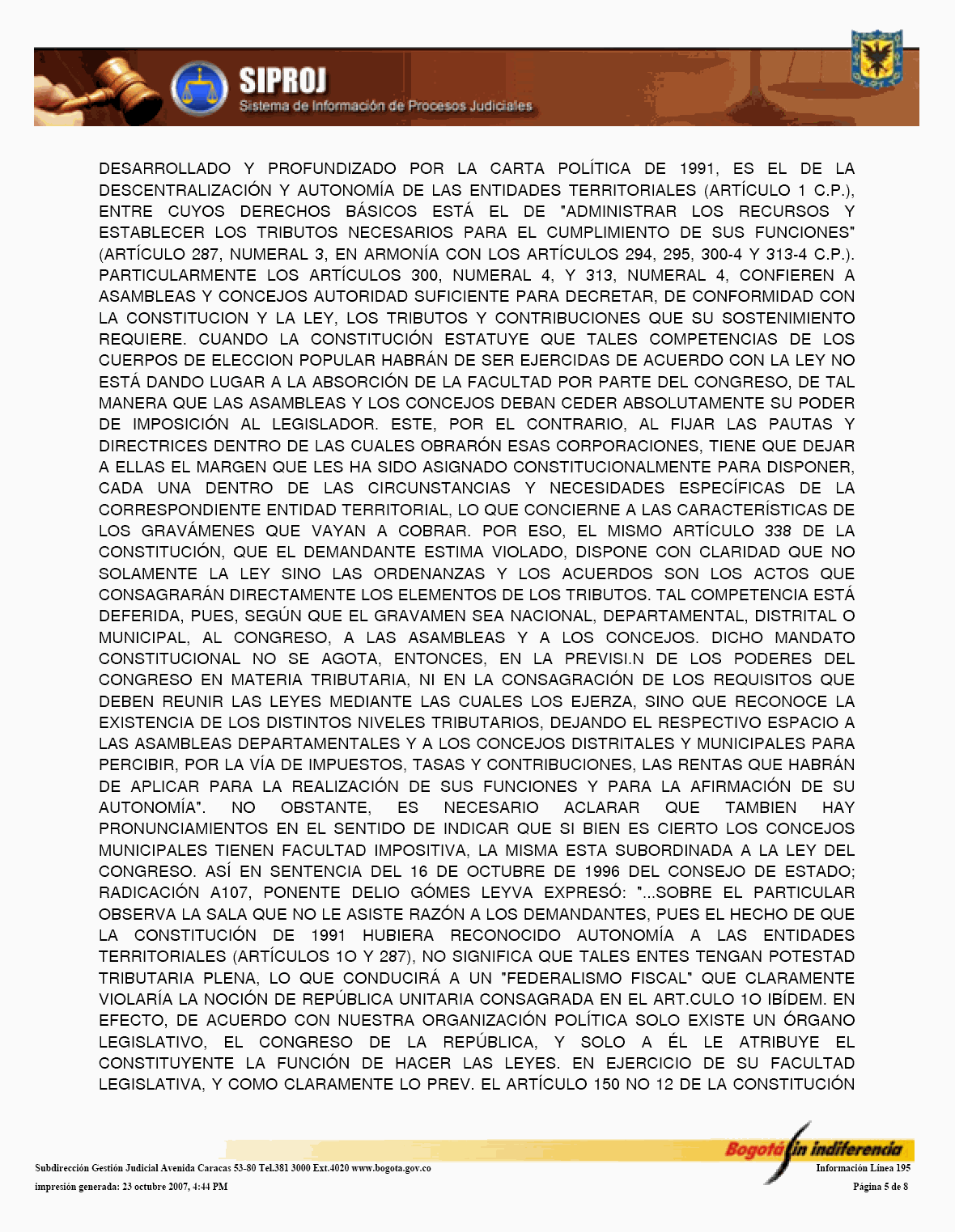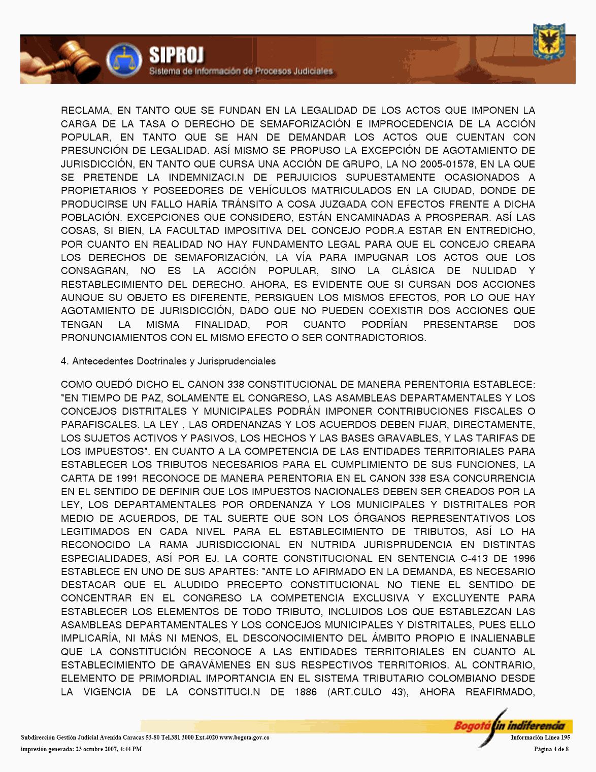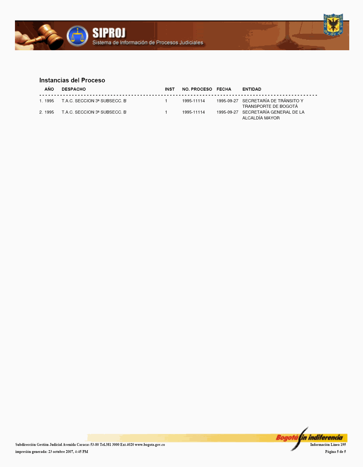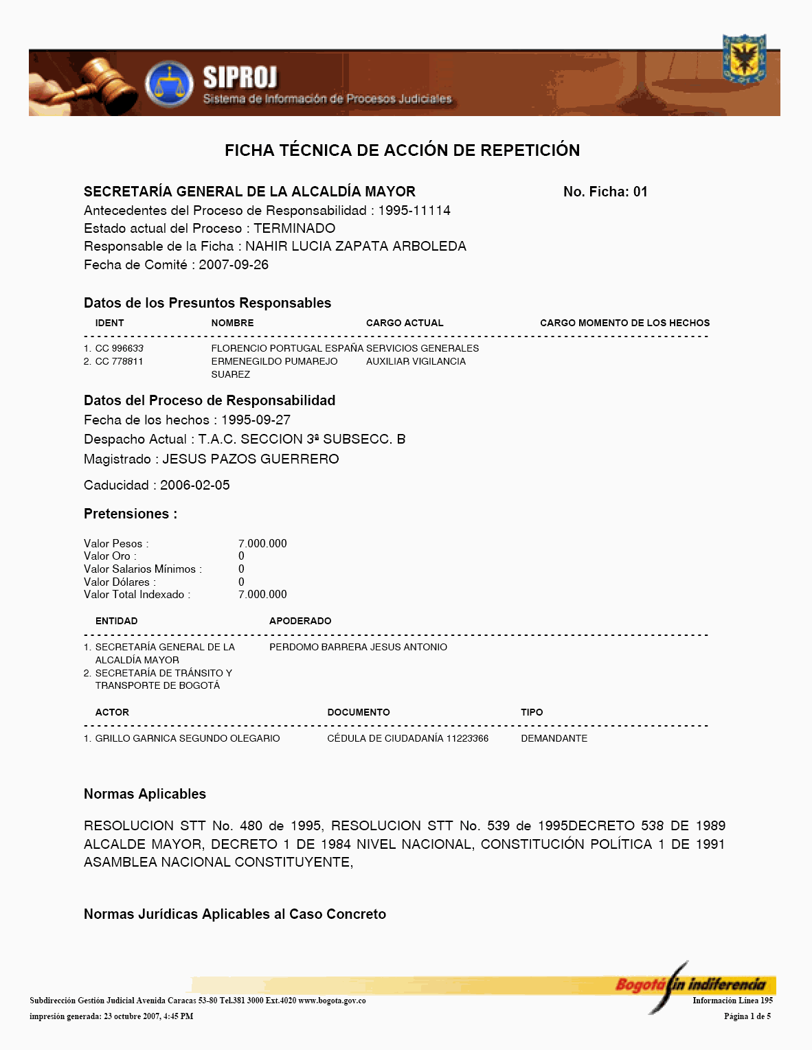 El Sistema de Información de Procesos Judiciales -SIPROJWEB Bogotá-, como Sistema en red (on line) de gestión, implementado a través de una aplicación WEB, ha permitido a las entidades y organismos que hacen parte de la estructura administrativa del Distrito Capital: Crear, incorporar, organizar y buscar la información relacionada con los procesos contenciosos, constitucionales, laborales, civiles, penales, tutelas y conciliaciones entre otros, convirtiéndose en una herramienta de trabajo que facilita la gestión y la prevención del daño en temas jurídicos, en los que hace parte el Distrito Capital. En este orden de ideas, la Administración considera pertinente, frente al Módulo de Conciliación, expedir algunas instrucciones a los organismos y entidades, a fin de facilitar el manejo y operatividad de dicha herramienta, para el efecto se permite establecer las siguientes directrices: 1. El Jefe Jurídico de la entidad u organismo, por medio de oficio dirigido al Subdirector de Gestión Judicial de la Secretaría General de la Alcaldía Mayor de Bogotá D.C., deberá solicitar la creación del usuario con la asignación del perfil y clave correspondiente para el manejo del Módulo. 2. El jefe jurídico deberá informar las novedades relacionadas con la vinculación y desvinculación de los servidores públicos y/o contratistas, así como solicitar las correspondientes capacitaciones en los diferentes Módulos del SIPROJWEB. 3. Para facilitar la labor de los Secretarios Técnicos de los Comités de Conciliación, es necesario que alleguen a la Subdirección de Gestión Judicial, el nombre del actual Secretario Técnico junto con la dirección electrónica y teléfono de contacto correspondiente para ser incorporado en el aplicativo y habilitarle el privilegio para modificar las fichas técnicas, tanto de Conciliación como de Repetición, garantizándole la posibilidad de realizar la programación oportuna de los comités a través del módulo de mantenimiento, así como el correcto y oportuno diligenciamiento de la información. 4. El apoderado o quien incorpore o actualice la información en SIPROJWEB frente a procesos terminados, deberá señalar la fecha de ejecutoria del fallo, en la medida que ésta la tomará el Sistema para efectos del cálculo de la caducidad para iniciar la Acción de Repetición. 5. Módulo Conciliación Prejudicial. En este módulo se debe ingresar la información relacionada con este tipo de conciliación. Teniendo en cuenta que por no tratarse de procesos judiciales, el número para la radicación varía, razón por la cual, en la casilla marcada en SIPROJWEB como "No. CDI" se colocará la radicación de la entidad ante la que se va a surtir la Conciliación o la radicación con el número asignado en la oficina de correspondencia, o en su defecto, el número interno de reparto al interior de la entidad. Las Conciliaciones Prejudiciales deben actualizarse de la misma manera que los procesos judiciales, con el fin de tener en el sistema la información real y oportuna para la entidad. De no encontrarse actualizada dicha información, y en el evento de encontrarse terminados estos asuntos, el sistema validará la información como activa. 6. Diligenciamiento de las Fichas de Conciliación Prejudicial. Para la elaboración de fichas de conciliación prejudicial es prerrequisito radicar previamente la información del proceso en el módulo de prejudiciales. Las fichas tanto de Conciliación, como de Repetición, deberán ser tramitadas en su totalidad por el abogado a cargo del proceso y remitidas previamente al Secretario Técnico a través del aplicativo en SIPROJ. 7. Comité de Conciliación. Como parte de esta directiva, se anexa el formato único de Acta de Conciliación, que deberá ser utilizado por la entidades u organismos distritales en el cual se especifica entre otros ítems, el tipo de proceso, las partes, el número del expediente que se somete a consideración del Comité, al igual que la decisión adoptada por el mismo frente al tema. Una vez aprobada el Acta, deberá remitirse fotocopia de la misma con medio magnético a la Subdirección de Gestión Judicial dentro de los 30 días siguientes, para su correspondiente protocolización, tematización e ingreso a los Sistemas de Información Jurídicos. Por lo anterior y de conformidad con la Directiva Nº 003 del 28 de junio de 2006 del Alcalde Mayor donde se oficializa la entrada en funcionamiento de este Módulo, solicito se tengan en cuenta las anteriores recomendaciones en aras de garantizar la seguridad del Sistema, la confiabilidad en la información y la oportuna alimentación del mismo, por parte de los responsables en cada una de las entidades y organismos. Cordialmente, ENRIQUE BORDA VILLEGAS Secretario General Alcaldía Mayor de Bogotá D.C. FORMATO ACTA DE COMITÉ 1. ENCABEZADO: Debe contener: Número Consecutivo del Acta, seguido de la fecha y el nombre de la entidad y/o organismo a la cual corresponde el acta. Todo en NEGRILLA, CENTRADO.