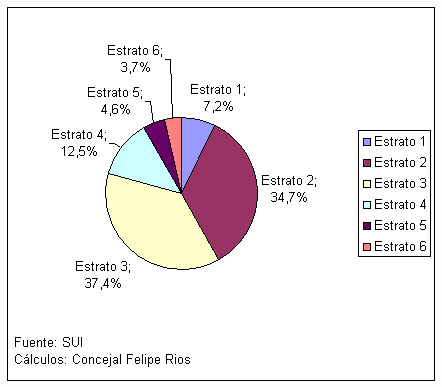 Los resultados hablan por sí mismos. En el escenario de bajo ahorro (18%) el ahorro de un suscriptor alcanza para pagar casi 3 meses adicionales de energía, para todos los estratos. En el escenario de ahorro alto (37%) el ahorro de un suscriptor le alcanza para otro medio año de consumo. *IMPACTO SOBRE EL CONSUMO DE AGUA POTABLE Los mecanismos para ahorrar agua potable son análogos a los empleados para ahorrar energía. Aprovechamiento de las aguas lluvias e instalaciones sanitarias que consumen menor cantidad de agua son las principales estrategias. Los datos de ahorro en agua no son tan precisos como los de ahorro en energía eléctrica, sin embargo se estima que pueden encontrarse entre 20% y 30%. Al igual que con el consumo de agua potable los suscriptores se concentran en los estratos 2 y 3. La distribución de los suscriptores aparece en el Gráfico 3. El total de suscriptores residenciales al servicio de agua potable es poco más de la mitad que el de suscriptores a energía eléctrica aunque se distribuyen de forma similar. Gráfico 3 - Suscriptores al servicio de energía eléctrica, promedio mensual año 2007