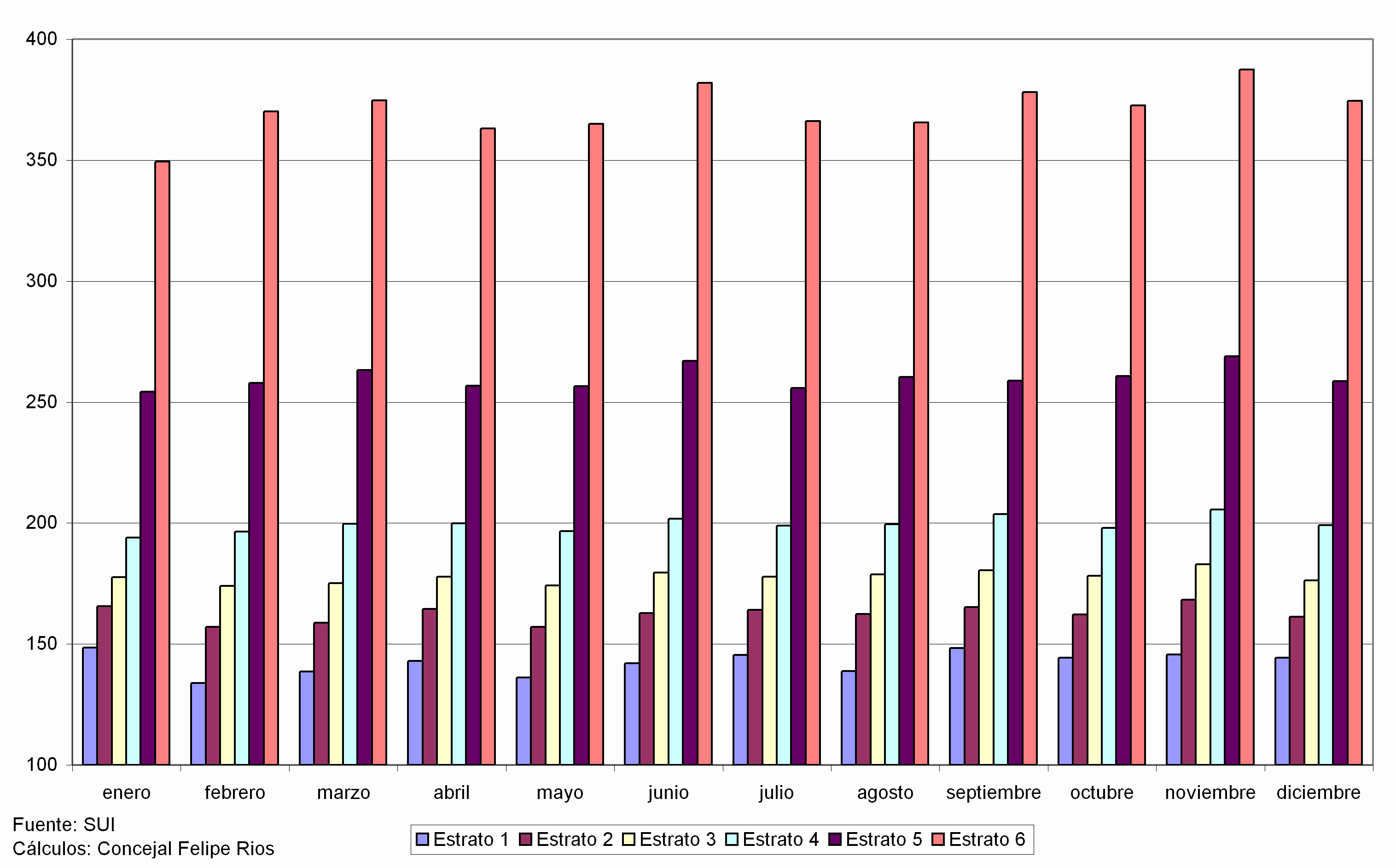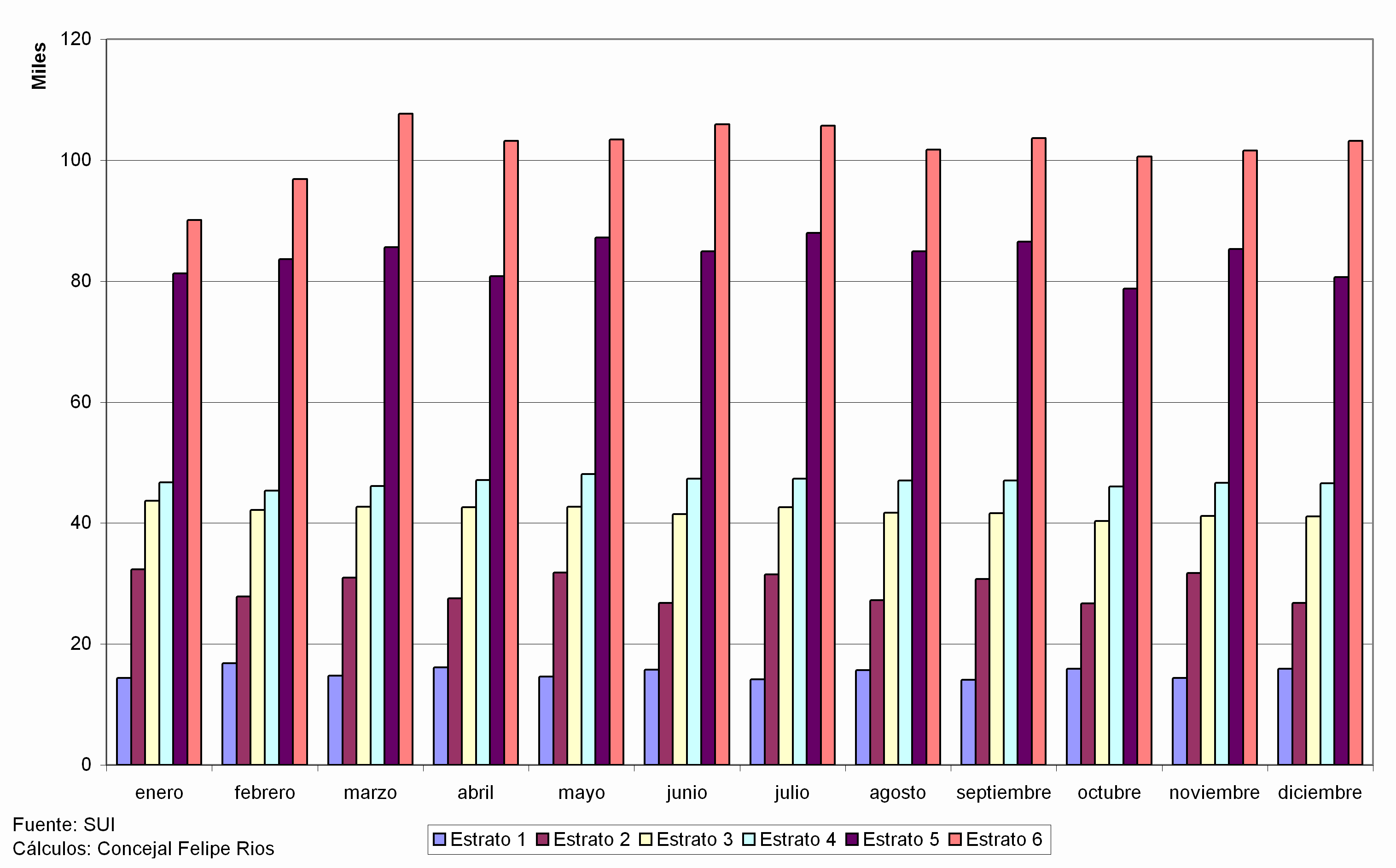 Respecto al valor pagado por cada estrato la tendencia es la esperada. Los suscriptores de estratos más altos pagan más que los de estratos bajos. La tendencia de los costos para cada estrato se mantiene relativamente estable a lo largo del año. Gráfico 5 - Consumo por suscriptor, pesos reales de diciembre de 2007