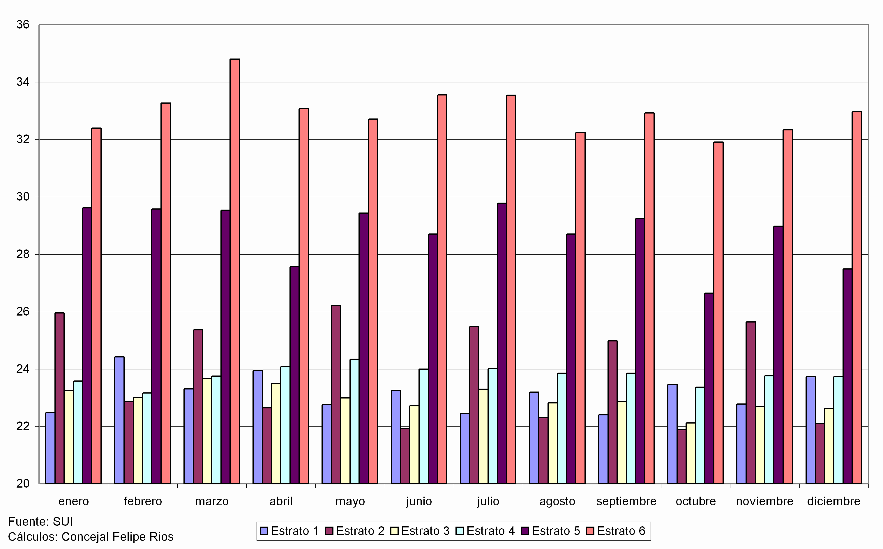 Al igual que con la energía eléctrica los estratos 5 y 6 son los mayores consumidores de agua potable. En algunos meses los sigue en consumo el estrato 2 o el estrato 1. El Gráfico 4 muestra los metros cúbicos (M3) consumidos mensualmente por cada estrato. Gráfico 4 – Consumo observado por suscriptor (M3), año 2007