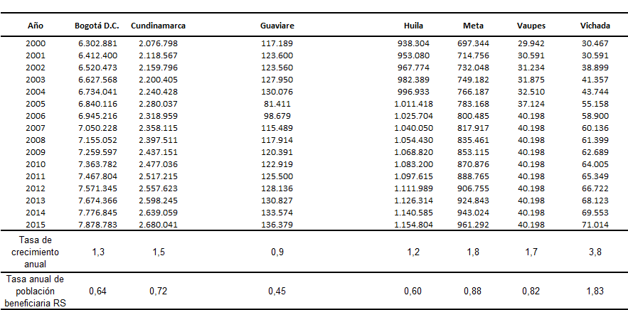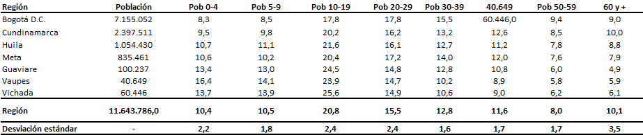 Fuente: Proyecciones de población DANE, Censo 2005. Como se puede apreciar en el cuadro 4, el 70% de la población en la región es menor de 40 años con ± 5,9 desviación estándar en Bogotá y Cundinamarca se concentra el menor porcentaje de población menor de 40 años, mientras que en Huila, Meta, Guaviare, Vaupés y Vichada, la población menor de 40 años osciló entre 72 y 78% (percentil 75), y con una esperanza de vida en estos territorios más baja que la observada en Bogotá y Cundinamarca. En el área urbana o cabecera municipal se concentra el 41,3% ± 23,9 Desv St de la población total de la región. Sin embargo, en el 22,6% de los municipios y 2 corregimientos se concentra la población urbana ubicada en el percentil25 es decir, el menor porcentaje de población urbana (22,9%), distribuidas de la siguiente manera, 73,5% en Cundinamarca; 14,3% en Huila; 8,2% en Meta y 2,0% en Vaupés y Vichada respectivamente. La dinámica de crecimiento de la población entre el año 2000 y 2015, según las proyecciones de población DANE del año 1993 y 2005, muestran que en la región la tasa de crecimiento promedio de anual es cercana al 1,74, siendo mayor en los departamentos de Vichada y Meta e inferior en Guaviare y Huila, ver cuadro 5. Cuadro 5. Crecimiento poblacional en la Región Centro Oriental RS, 2000 -2015
