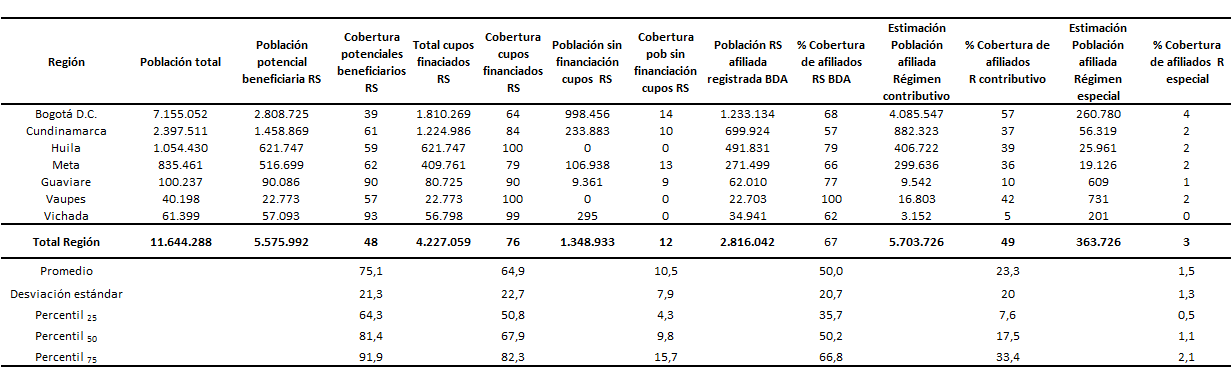 Fuente: Proyecciones de población Dane, Censo 2005. Como se aprecia en el cuadro 6, existe en la región 5.575.992 personas identificadas por la última encuesta SISBEN como potenciales beneficiarios del régimen subsidiado en salud, equivalentes al 48% del total de habitantes de la región. Al interior de los 216 territorios en estudio el promedio de población potencial beneficiaria está alrededor del 75%. Del total de población susceptible solo faltan por financiar entre los años 2008 y 2010, el 12% de los cupos de afiliación al régimen subsidiado. Sin embargo, es necesario realizar esfuerzos importantes para identificar y afiliar la población potencial beneficiaria, ya que el promedio de cupos financiados, identificados y carnetizados es del 50% ± 20,7 desviación estándar. Es decir, solo estos han accedido al sistema. Cuadro 6. Distribución de población y cobertura por régimen de afiliación Región Centro Oriental RS, 2008.