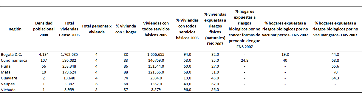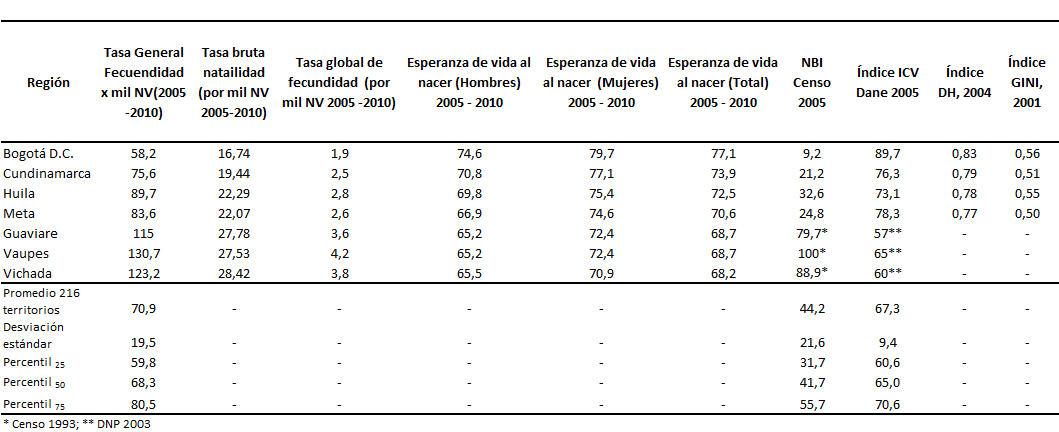 Fuente: Proyecciones DANE / PNUD /DNP En el cuadro 7, se observa que los departamentos de Vaupés, Vichada y Guaviare presentan en su orden de importancia los indicadores de fecundidad más altos, lo que explica las altas tasas de crecimiento anual de la población. Este resultado también es muy importante relacionarlo con la tasa de morir por embarazo parto, puerperio y mortalidad infantil. Las condiciones deficientes del entorno se comportan como riesgos para la salud. Como se puede apreciar en el Cuadro 8, en los hogares de la región aproximadamente del 12 al 32% están en condiciones de hacinamiento, la proporción más alta se ubica en Vaupés y Guaviare, en comparación a los detectados en Bogotá, Cundinamarca, Meta y Huila, a pesar que en estos departamentos y distrito existe la mayor densidad poblacional. Adicionalmente, los riesgos biológicos asociados a la baja respuesta de protección de riesgos colectivos (cobertura vacunación de perros, gatos, acciones de prevención y control del dengue, acceso agua potable) son factores negativos asociados con la morbilidad y mortalidad por enfermedades transmisibles. Cuadro 8. Descripción condiciones sociales en la región centro oriental RS, 2005 - 2010