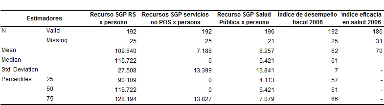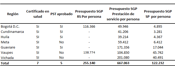Fuente: DGSP MPS -DNP CONPES 112 de 2008 En Vaupés la asignación de recursos por persona para cubrir el cupo de afiliación al régimen subsidiado en los corregimientos, los cuales son administradas por el departamento, son insuficientes en la medida en que estas zonas no disponen de red de servicios ubicadas en las áreas pobladas y la accesibilidad de la población a los servicios está limitada a los equipos extramurales de salud que en promedio visitan 2 a 3 veces al año. Esto implica que la atención de los daños deba realizarse en la cabecera municipal que puede estar a más de 8 días de camino en la selva. El promedio de recursos asignados por persona en las 20 localidades del distrito y 196 municipios de la región para el régimen subsidiado en salud es del orden de 109.640 pesos año ± 27.508 Desv St, que incluyen la UPC adicional por dispersión geográfica asignada a los municipios de Vaupés, Guaviare y Vichada (Cuadro 10). Con una disponibilidad de 7.188 pesos persona año ± 13.399 desviación estándar, para cubrir servicios NO POS y la atención de la población pobre no afiliada, estimada en el cuadro 6. Cuadro 10. Recursos del Sistema General de Participaciones en Salud por Persona 2008 e índice desempeño y eficacia 2006 en la Región Centro Oriental RS