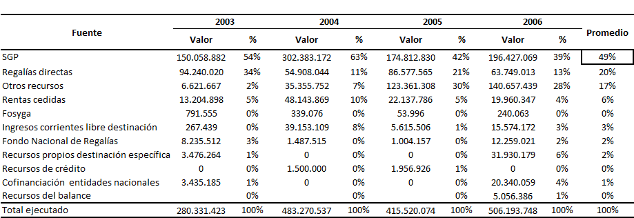 Fuente: Ministerio de Hacienda/DNP. CONPES social 112 de 2008. Los recursos de atención se complementan con los 8.257 pesos personas año ± 13.381 desviación estándar, asignados para atender los riesgos en salud pública, sin incluir en este valor las otras fuentes de financiación como puede analizarse en el cuadro 11, que equivalen alrededor del 51%. Cuadro 11. Fuentes de los recursos departamentales en salud pública. Periodo 2003-2006. Cifras en miles de pesos, valores corrientes.
