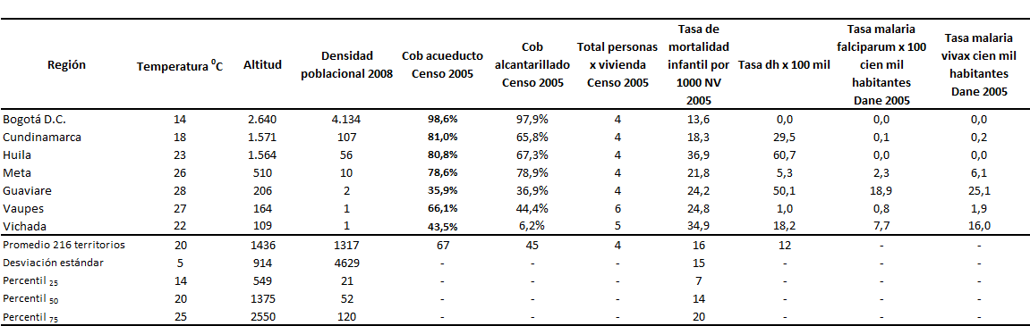 Fuente: Base de datos SICEP – Departamento Nacional de Planeación A continuación se describen el comportamiento de las variables proximales estratificadas en cuatro categorías de riesgos en salud: ambientales, sociales, servicios de salud y biológicos. a. Variables proximales relacionadas con los riesgos ambientales para la salud (físicos y químicos) Existen grandes diferencias en los patrones climáticos, geográficos y de acceso a agua potable y saneamiento básico en la región que explica diferentes patrones de riesgo. El cuadro 12 muestra que los territorios con temperatura promedio ubicadas entre el percentil 50 y 75 tienen mayores tasas de riesgo de enfermedades vectoriales. Esta relación ha sido explicada por diferentes autores mediante la interacción permanentemente con riesgos ambientales y antrópicos. Es importante resaltar, que la baja cobertura de agua potable a través de sistemas de acueductos, favorecen la proliferación de vectores transmisores de dengue, especialmente en conglomerados humanos densos y hacinados, por ejemplo lo que ocurre en Guaviare. Cuadro 12. Descripción de riesgos ambientales para la salud Región Centro Oriental RS