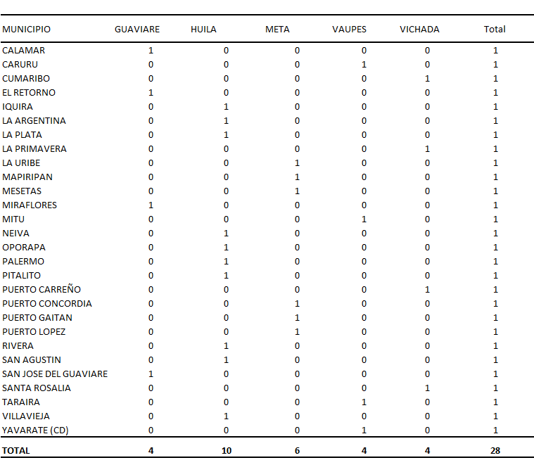 Fuente: DANE, Censo 2005; ENS 2007. En la región, existen 117 municipios que tienen temperatura que oscilan entre 20 - 30 grados centígrados con un promedio de 24,2 0C, distribuidos así: 38,5% en Cundinamarca; 26,5% en Huila; 23,1% en Meta; 5,1% Vaupés y 3,4% respectivamente en Guaviare y Vichada. Otra característica que se resalta es la falta de disposición de agua en las viviendas. Esto contribuye además, con las altas tasas de mortalidad infantil que se ven más agravadas cuando existe baja cobertura de sistemas de recolección de aguas negras y excretas, como ocurre en Vichada, en contraste con el comportamiento observado en el Distrito Capital. b. Variables proximales relacionadas con los riesgos sociales para la salud. Se identificó que el 12,9% (28/216) de los territorios en estudio tienen resguardos indigenas. En esta región existe la presencia de más de 50 etnias diferentes. El departamento de Huila y Meta concentran más del 57% de estos resguardos. Este hallazgo, es muy importante para adecuar el modelo de atención en salud a la tradición y cultura de estos pueblos, toda vez, que en la actualidad solo la EPS Mallamas está orientando su modelo de atención a estas necesidades, lo que se convierte en una de las principales barreras de acceso a la cultura ancestral identificada en la mesa de salud de los pueblos indígenas (Cuadro 13). Cuadro 13. Ubicación de resguardos indígenas por municipio Región Centro Oriental RS