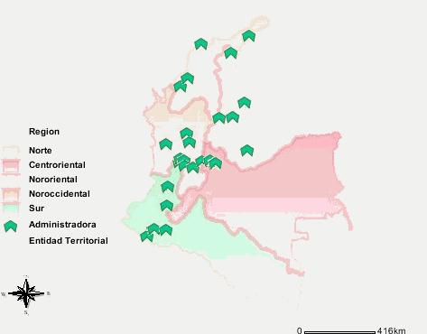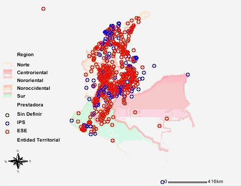 Fuente: SOGCS- MPS. Base registro de prestadores – Resolución 1043 de 2006. En el siguiente mapa se presenta la ubicación geográfica de la red de instituciones prestadoras de servicios de salud en cada una de las regiones del país y se observa una baja cobertura de instituciones (IPS y ESE) funcionando en Vichada, Vaupés y Guaviare. Mapa 2. Ubicación regional de las instituciones prestadoras de salud Régimen subsidiado y entidades territoriales, 2008