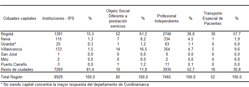 Fuente: SOGCS- MPS. Base registro de prestadores – Resolución 1043 de 2006. El total de prestadores registrados ofertan aproximadamente 34.587 servicios habilitados, de los cuales solo 3,6% de ellos, están certificados SOGCS. Y el número de camas de hospitalización que ofertan es del orden de 1,14 camas por mil habitantes. De las 1.660 instituciones que funcionan en la región, es muy bajo el porcentaje ubicado en el área urbana de San José, Mitú y Puerto Carreño. De igual manera, la disposición de ambulancia está concentrada en Bogotá, con un porcentaje del 30% dispersa entre las diferentes ciudades de la región, como se parecía en el cuadro 16. Cuadro 16. Distribución porcentual de prestadores registrados Región Centro Oriental RS, 2008
