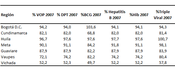 Fuente: Superintendencia Nacional de salud - SIGGRESS La capacidad de respuesta de los servicios de promoción y prevención observada en la región, durante la vigencia abril 2006 a marzo 2007, estimada mediante la calificación de cumplimiento de actividades obligatorias para la detección temprana y protección específica de enfermedades prevenibles incluidas en el POS, mostraron que en el primer lugar (puntaje superior a 64%) están las EPS Salud Total S.A, en Bogotá, Meta, Guaviare y Vaupés. Seguida de Cafesalud, en Huila y Asmethd Salud, en Vichada. Y, en segundo lugar, Mutual Ser (Bogotá), Cafam (Cundinamarca), Ecoopsos (Huila y Guaviare) y Comfacor (Meta). Adicionalmente, la respuesta de los servicios de protección específica valorados a través de la cobertura de esquema de vacunación en menores de 12 meses de edad, muestran que en Guaviare, Cundinamarca, Vaupés y Vichada existen condiciones desfavorables en la calidad de la atención, situación que afecta el cumplimiento de la meta de cobertura (mayor a 95%). Estos hallazgos, alertan frente a la eficiencia, eficacia y efectividad de la red de prestadores que operan en estos territorios, por lo cual es indispensable revisar con detenimiento las minutas de los contratos que actualmente están vigentes para verificar cuales son los compromisos que se adquieren y el modelo de negocio que opera (Cuadro 17). Cuadro 17. Cobertura de vacunación en menores de 12 meses Región Centro Oriental RS, 2007.