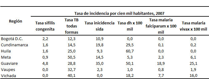 Fuente: DANE, Registros de estadísticas vitales 2005 y Población Censo 2005. La morbilidad atendida por enfermedades transmisibles evitables, evidencia varios problemas relacionados con los servicios de salud individual y colectiva. En primer lugar, la calidad e integralidad en los servicios de control prenatal, toda vez que la sífilis congénita es una enfermedad evitable altamente costo efectiva, mediante la aplicación de tratamiento a la gestante. La no intervención tiene alto costo en salud y social (neurosífilis, retardo mental, cardiopatía congénita y muerte). En segundo lugar, fallas en la búsqueda activa institucional y comunitaria para detectar y tratar la tuberculosis pulmonar, generando alto costo en salud por hospitalización y social por incapacidad y muerte. En tercer lugar, existe deterioro de las acciones de control social y reordenamiento del medio para el control vectorial, deterioro de las acciones de promoción de la salud (empoderamiento social, participación, control del medio ambiente, reorientación a los servicios de protección de la salud pública (APS y Central de Llamadas) y diseño de intervenciones con la comunidad (Cuadro 19). Lo antes descrito es una oportunidad para que la EPS Distrito, adecue en el modelo de atención intervenciones ligadas a la salud colectiva, abriendo un escenario nuevo de acceso a los recursos del Plan de Intervenciones Colectivas. Cuadro 19. Incidencia de enfermedades transmisibles por cien mil habitantes Región Centro Oriental RS, 2005.
