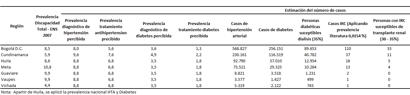 Fuente: MPS-SIVIGILA, 2007 Es de alta importancia, considerar la prevalencia de las enfermedades catastróficas, por ejemplo el Sida y la prevalencia de enfermedades de alto costo y discapacidad. Así como las políticas de cuidados integrales relacionadas con cobertura de tratamiento, cuidados paliativos y de rehabilitación, para el diseño del modelo de atención, especialmente en Bogotá donde la prevalencia de infección por VIH en hombres que tienen sexo con otros hombres está alrededor del 18% y en Guaviare, Meta y Vichada, donde la prevalencia de VIH en población de mujeres trabajadoras sexuales es superior al 1%. Sin embargo, es de alto valor proyectar como mínimo el número de casos esperados para estimar el costo por tratamiento ARV, a partir de la prevalencia de transmisión en población general que está alrededor del 0,7%, según los últimos estudios de prevalencia poblacional realizada por el Ministerio de Protección Social. De igual manera, la prevalencia de enfermedades como la hipertensión y la diabetes son trazadoras para estimar la magnitud de enfermedades de alto costo como la insuficiencia renal crónica, y el tratamiento paliativo bien sea mediante diálisis o trasplante renal. En el país la prevalencia de diagnóstico de hipertensión percibida y diabetes percibida estimada en el Encuesta Nacional de Salud de Colombia, 2007, fue 0,88 y 3,5% respectivamente. Mientras que en Cundinamarca y Bogotá estas cifras fueron mayores (9,6 y 8,0% para HTA y 3,58 y 4,86% para DM). A partir de estos datos se estiman para la región, 977.696 casos de hipertensión y 443.950 casos de diabetes. El 58% de los casos estimados se concentran en Bogotá, seguido de 26% Cundinamarca, 8,3% Huila, 6,5% Meta y el resto se reparte en Guaviare, Vaupés y Vichada (cuadro 20). Con estas cifras se estima que 155.383 personas necesitaran tratamiento con diálisis, 178 desarrollaran IRC y 54 requieran trasplante de renal. Cuadro 20. Prevalencia de enfermedades alto costo Región Centro Oriental RS, 2007.