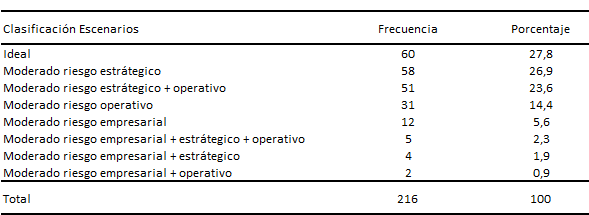 Fuente: Encuesta Nacional de Salud, MPS 2007 Análisis de escenarios potenciales de desarrollo y de expansión para la EPS Distrital La configuración de escenarios potenciales de desarrollo y expansión se realizó combinando las categorías de análisis estructural, intermediario y proximal en salud y las subcategorías de riesgo de primer, segundo y tercer orden. Posteriormente, se cruzaron entre sí las tres categorías de analisís y se identficaron 8 tipos de escenarios a saber, escenario ideal; moderado riesgo estratégico; moderado riesgo estratégico + operativo; moderado riesgo operativo; moderado riesgo empresarial; moderado riesgo empresarial + estratégico + operativo; moderado riesgo empresarial + estratégico y moderado riesgo empresarial + operativo (ver mapas 3 al 9). Con base en lo anterior, se estimaron las estadísticas descriptivas más relevantes que caracterizan las 8 tipologías de escenarios identificados en los 216 territorios en estudio (Cuadro 21). Cuadro 21. Clasificación de escenarios propuestos para la EPS Distrital