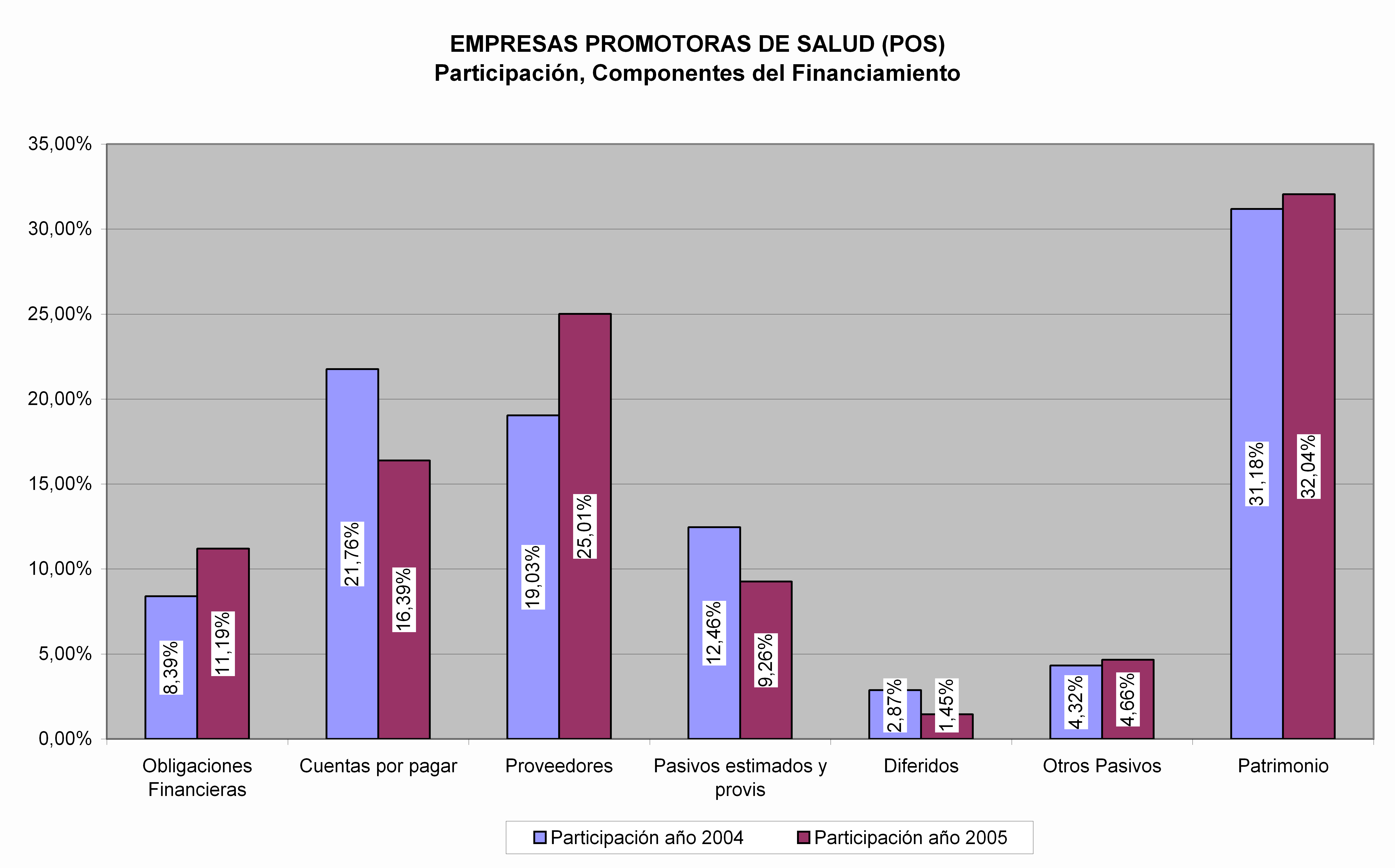 Fuente: Serrano (2008) Contrariamente a lo que ocurre en otras industrias, el nivel de apalancamiento operacional es relativamente bajo; las inversiones en propiedad, planta y equipo corresponden a un porcentaje muy bajo de los activos de los diferentes tipos de entidades; en este sentido el activo principal corresponde a la cartera de deudores que se genera en la cadena de prestación de servicios: FOSYGA con las EPS y las ARS y éstas con las IPS. Es importante anotar que hoy la fuente principal de la estructura de financiamiento del capital de trabajo la constituyen los proveedores, lo cual puede resultar insostenible en el largo plazo por los riesgos de liquidez. En la siguiente figura se muestra la estructura de financiamiento tanto de las EPS como de las ARS.