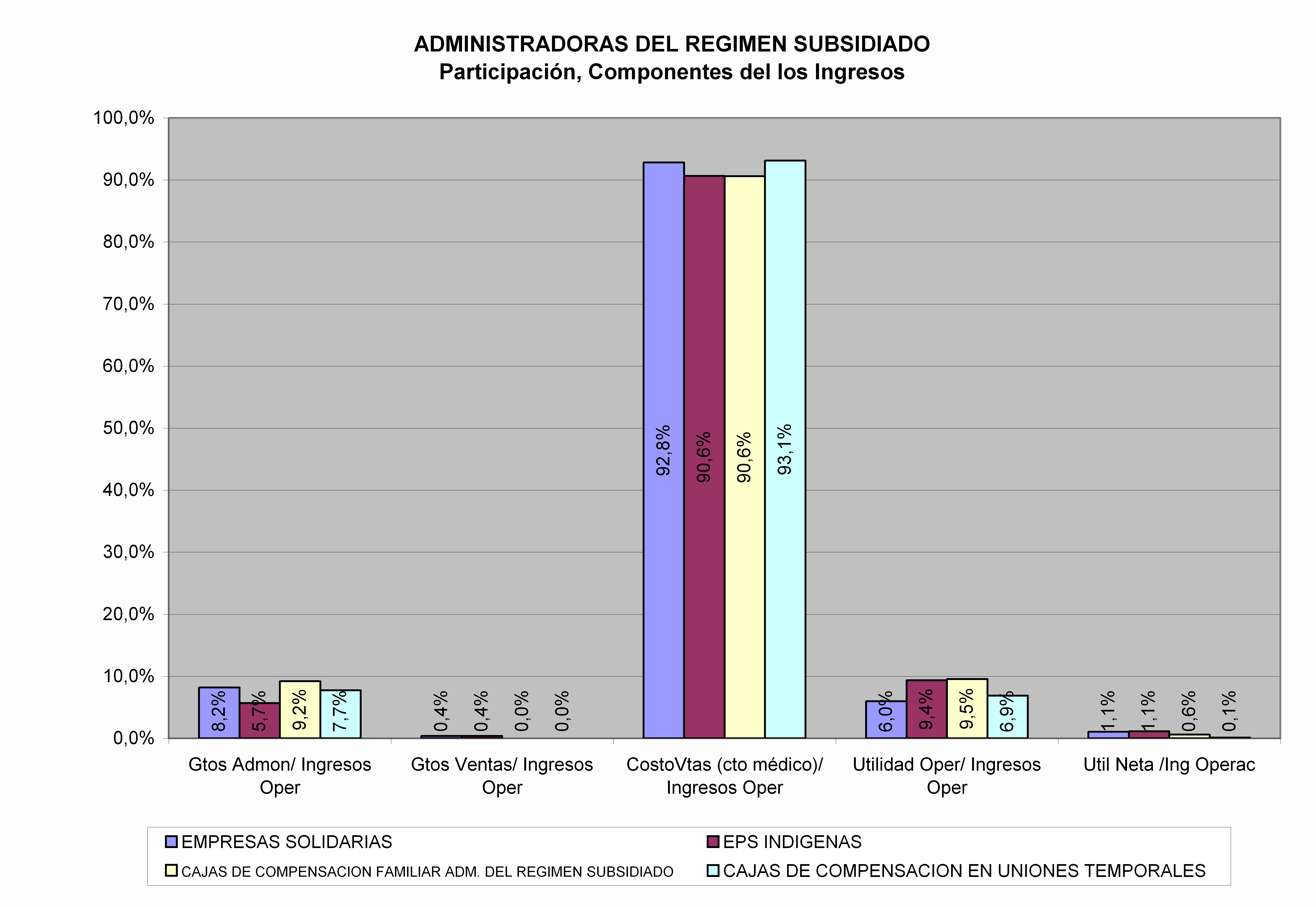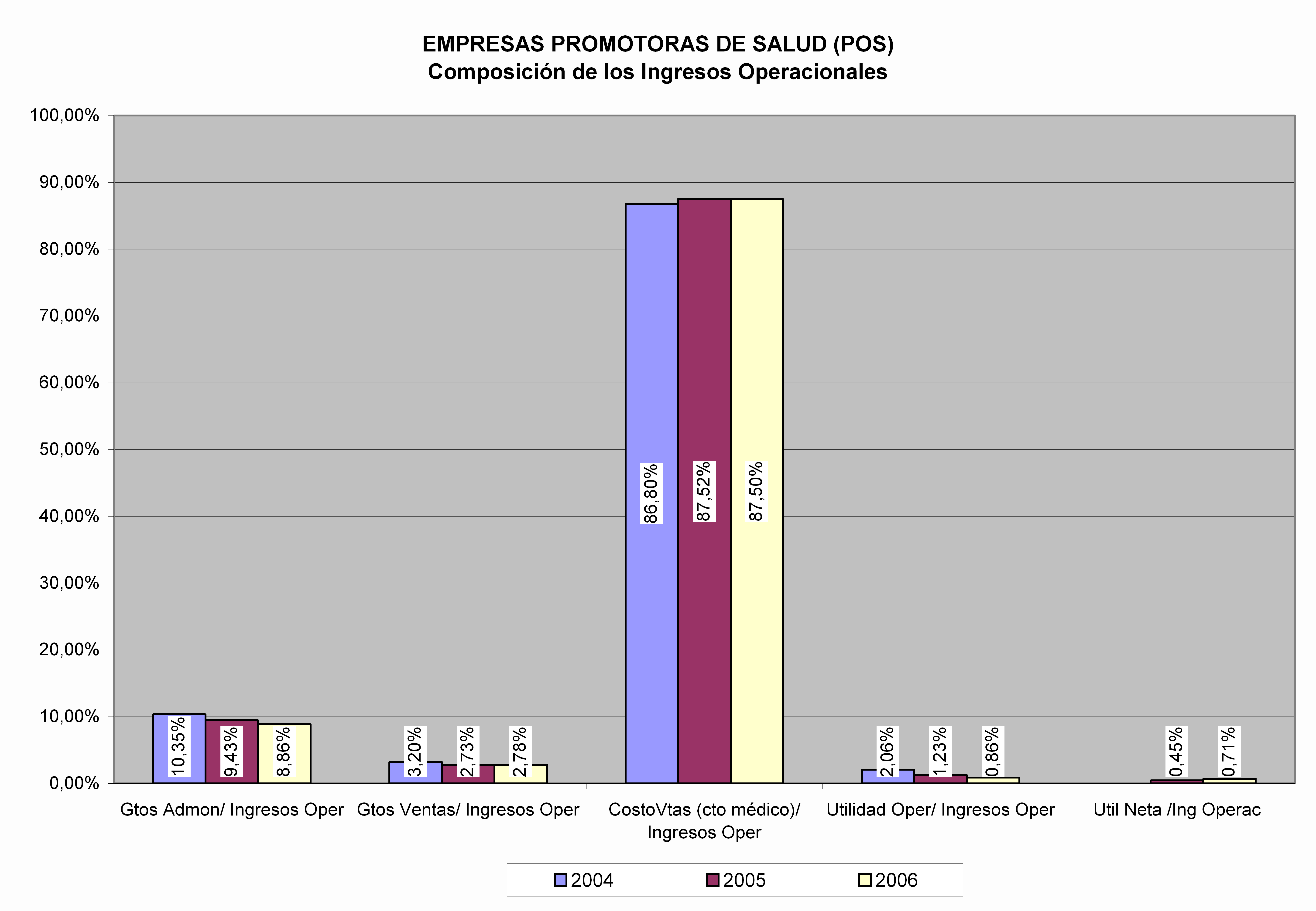 Fuente: Serrano (2008) La rentabilidad de las EPS se caracteriza por unos márgenes muy estrechos, que han venido disminuyendo, tal y como se observa en la siguiente gráfica. La disminución en los márgenes se explica principalmente como consecuencia del aumento de la participación del costo médico (costo de ventas), que ha llevado a las entidades aseguradoras a aumentar su eficiencia en la operación, administración y promoción de los servicios que ofrecen. Desde el punto de vista financiero surge el cuestionamiento sobre la suficiencia de los márgenes que genera el negocio frente a los riesgos que se tienen que asumir y que pueden estar aumentando significativamente como consecuencia de cambios en la población o en la tipología de las enfermedades.