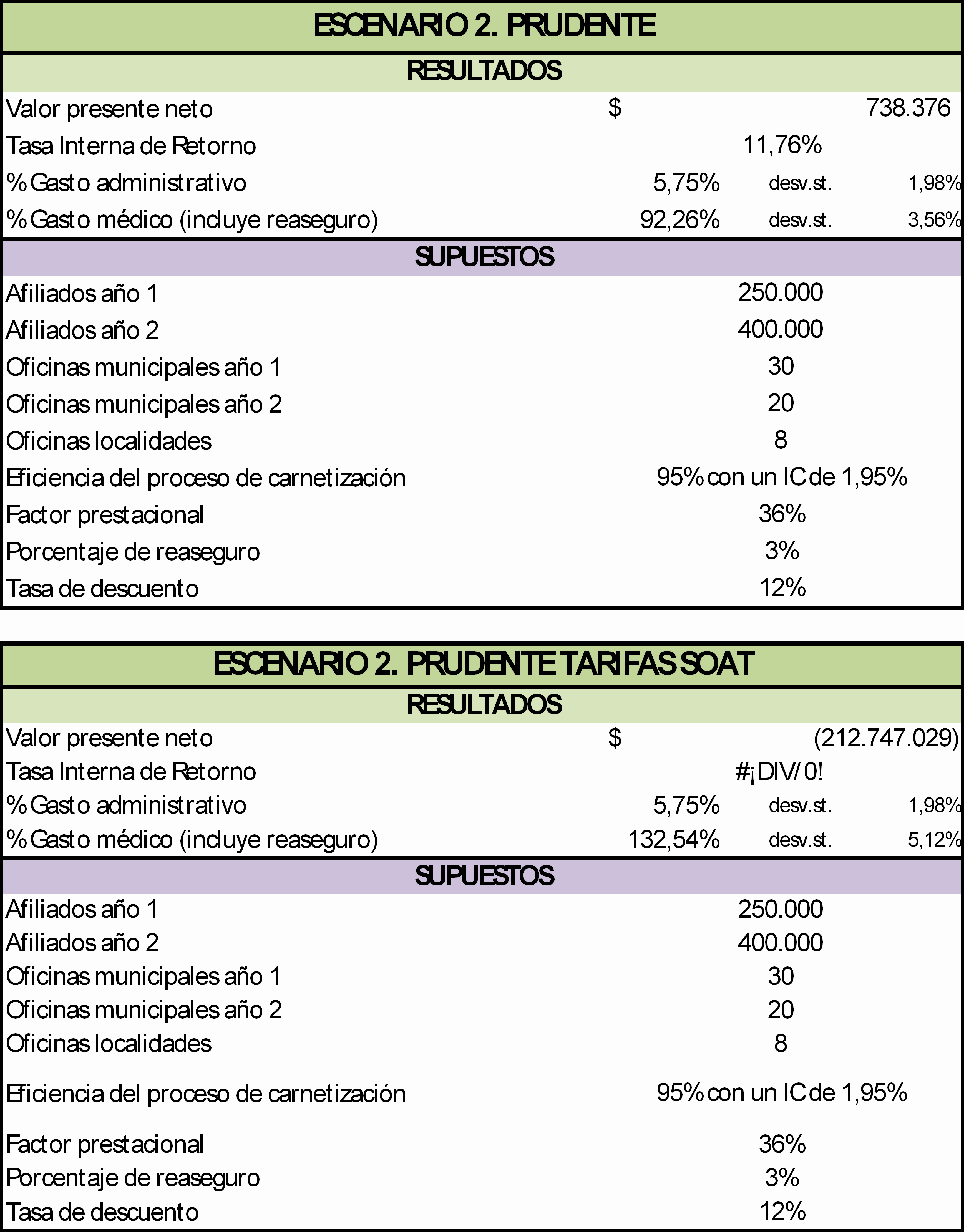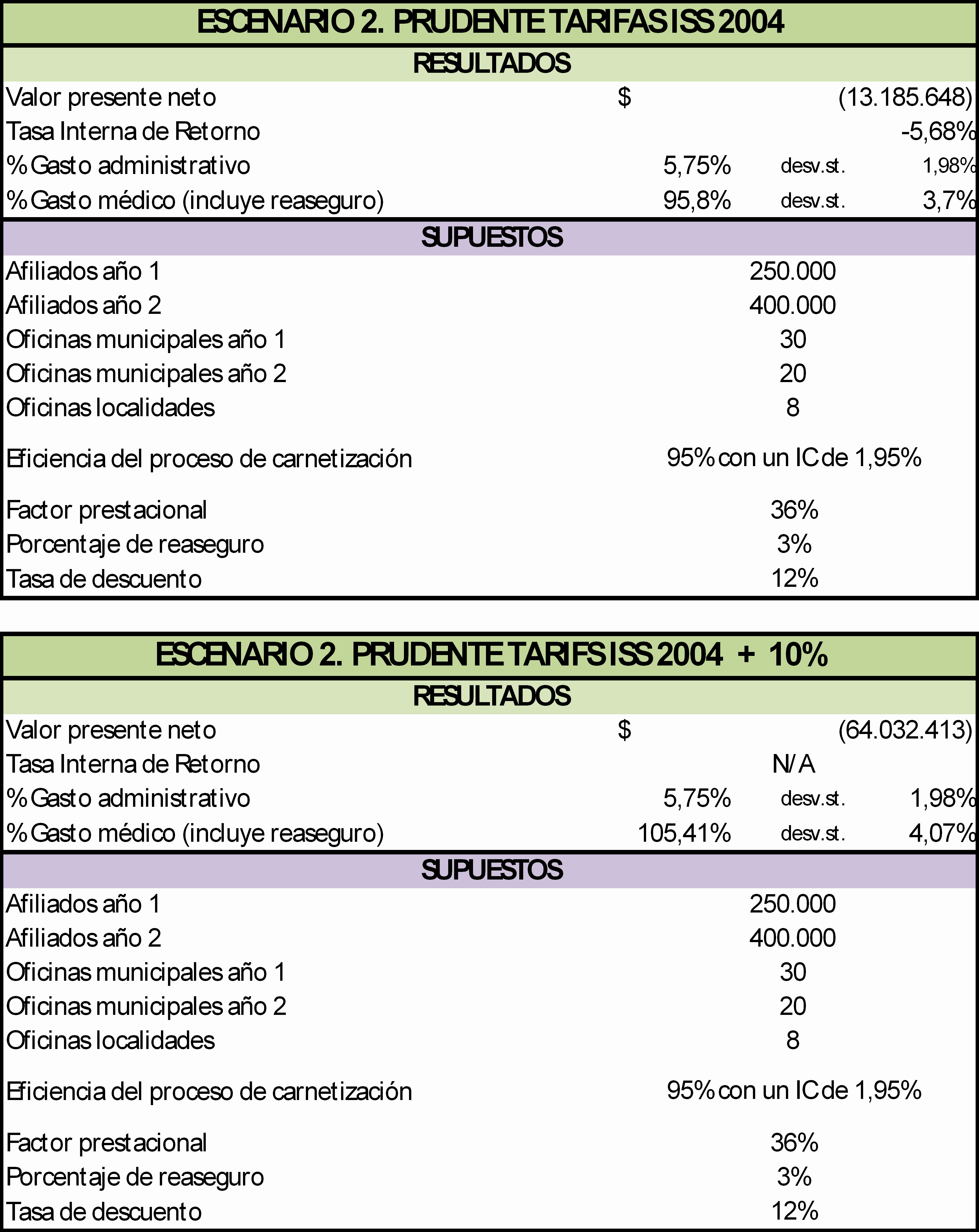 Este hecho conduce a que solo sea posible contabilizar el 92% de los ingresos efectivos de la UPC3 al principio y el 97 al final. Por otra parte el descuido para hacer eficientes los procesos de recaudo, reconocimiento de derechos y validación de la base de datos, en niveles del 97% comparables con las EPS del Régimen contributivo, harían inviable la EPS del distrito, dado el escaso margen de administración admitido, del 8%. Reaseguro para enfermedades de alto costo De acuerdo a la revisión y a la consulta a expertos se considera que el valor para reaseguro de enfermedades de alto costo oscila entre el 0.8% y el 3% del costo médico. Para efectos de los flujos de fondos se tomó como necesario un 3% del costo médico para reasegurar estas enfermedades. Para que sea posible cobrar la UPC es necesario asegurar la carnetización; para ello se requiere la contratación de un servicio de corretaje que en el mercado tiene un valor promedio de $10.000 por núcleo familiar carnetizado (se estima un promedio de 4 personas por núcleo familiar4). Para estimar el costo requerido cada año se asumió que el primer año se deben carnetizar el 92% de los afiliados y el segundo año el 92% de los nuevos y el 10% de sustitución por desafiliaciones, además, que este servicio se contrata sólo para el 40% de la población pues se supone que el 60% acude a las oficinas o participa en eventos masivos de carnetización. Incluyen gastos de nómina, funcionamiento, mantenimiento tanto de software como de equipos; discriminados por oficinas municipales, oficina central y de localidades en Bogotá y oficina administrativa general. Los ingresos por UPC corresponden a la UPC fijada para 2008, es decir $242.370, multiplicada por el número de afiliados efectivamente carnetizados, que corresponde al 92% de los afiliados que hayan elegido la EPS. Los ingresos financieros se estimaron considerando que la UPC se recibe en pagos bimestrales anticipados, sin embargo, los contratos que se realicen por capitación (estimados en el 60%) se deben pagar igualmente por anticipado. El restante 40% se puede invertir alrededor de un mes y se considera que en este período puede llegar a conseguir una rentabilidad del 1%. Adicionalmente se consideró que la EPS invierte a una tasa estimada anual del 8% el capital mínimo suscrito durante todo el horizonte del proyecto. Ingresos por descuentos por pronto pago Los descuentos por pronto pago generalmente se aplican a los servicios de tercer y cuarto nivel y, aunque operativamente implican un esfuerzo importante del personal de cuentas y tesorería, pueden servir como estrategia financiera. Mecanismos como estos ofrecen actualmente descuentos entre el 5 y el 10% por servicios de alta complejidad que en el mejor de los casos podría aplicarse al 20% del total de los gastos médicos. No existe en el país una fuente única y completamente validada para establecer estos valores. No obstante, la metodología elegida para estimar el costo médico siguió las siguientes premisas: a. Los costos derivados de las frecuencias de uso son mayores a medida que exista una mayor categoría urbana, como efecto derivado de la facilidad de acceso geográfico y cultural y de una mejor oferta de servicios. b. Existen estudios del equilibrio UPC - POS realizados para el Consejo Nacional de Seguridad Social y por el Gobierno con varias metodologías como: *Aplicando el gasto médico registrado en los estados financieros que reportan las EPS en la Superintendencia Nacional de Salud. Esta información se considera de mala calidad y de gran variabilidad.5 *Registrando y analizando las frecuencias reportadas por servicios prestados en los RIPS. Esta información presenta un elevadísimo nivel de subregistro, derivado de la modalidad de contratación por capitación que es la que se acostumbra para el primer nivel en el Régimen Subsidiado y por la negativa de muchas IPS públicas a presentar oportunamente los informes a que están obligados. *Mediante el registro y contabilización de frecuencias de uso que hacen las mismas aseguradoras. Esta modalidad se considera la más confiable aunque solo un número pequeño de EPS tiene sistemas robustos de información que permitan consolidar los datos. c. Existen varios sistemas tarifarios que podrían utilizarse para calcular los costos médicos, como por ejemplo las tarifas del ISS, las de la Resolución 2423 (SOAT) o las que recientemente calculó el CENDEX para el Ministerio de la Protección Social buscando sustentar un sistema obligatorio de tarifas.Para el análisis se tomaron tarifas del mercado que guardan su mayor semejanza con los cálculos del CENDEX. Estos precios corresponden a valores consultados con expertos sobre contratos y modalidades de pago reales y verificables actualmente en uso, y por lo tanto factibles. d. Para estimar las frecuencias de uso existen tanto los estudios contratados por el Ministerio y la información de diferentes compañías consultadas. Puesto que las frecuencias de uso son un factor crítico que se puede modificar desfavorablemente, se incluyeron en las simulaciones en tres escenarios, optimista, prudente y pesimista, incrementando en un 10 y en un 20% respectivamente la frecuencia de uso de cada servicio para los dos últimos. Depreciaciones y amortizaciones Las inversiones diferentes al software y a la estrategia de imagen, fueron depreciadas a tres años en todos los casos. Estas depreciaciones se incluyen como un gasto con el fin de ajustar la base impositiva pero luego se vuelven a sumar al flujo de fondos pues no representan un egreso real. Los impuestos se calcularon sobre la base del 36% sobre las utilidades operacionales. En el caso de que no haya utilidades los impuestos no se cobran. Para cumplir la normatividad vigente en cuanto a Capital Mínimo Suscrito, se incluyó un valor de 10.000 salarios mínimos mensuales ($4.615 millones de 2008) en el rubro de inversiones y se mantiene líquido a lo largo del pro