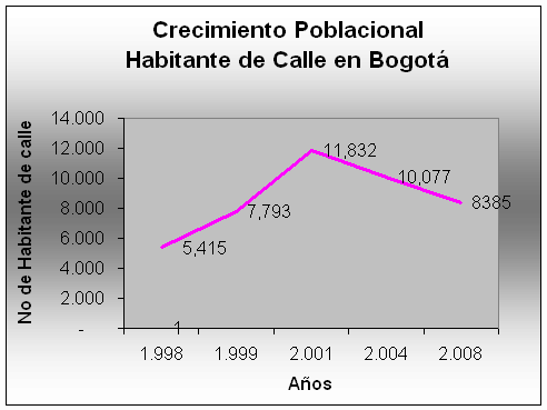PROYECTO DE ACUERDO No. 008 DE 2009 Ver Acuerdo Distrital 366 de 2009 Concejo de Bogotá, D.C. "Por medio del cual se establecen lineamientos de política pública para la atención, inclusión y mejoramiento de la calidad de vida del habitante de calle en el Distrito Capital, y se dictan otras disposiciones" EXPOSICIÓN DE MOTIVOS CONSIDERACIONES GENERALES El habitante de y en la calle, es la persona de cualquier edad, que generalmente ha roto en forma definitiva los vínculos con su familia y hace de la calle su espacio permanente de vida; la Secretaria de Integración Social actualmente, consideró como habitante de calle a quienes no residen de manera permanente en lo que se considera una vivienda prototípica como casa, apartamento o cuarto, por lo menos 30 días continuos; y de manera estable, al menos 60 días en la misma unidad. A esto podemos agregar que las principales causas de este fenómeno son una serie de factores socioculturales y económicos, como el desplazamiento forzoso, el abuso de sustancias psicoactivas, la violencia intrafamiliar y sexual, la dificultad de acceso a bienes y servicios, y en general el detrimento en la calidad de vida que sufren las personas ubicadas en zonas de alto deterioro urbano. "Algunas características de la población urbana que habita la calle se relaciona con el nomadismo circunscrito a territorialidades determinadas por las rutas de abastecimiento que construye con la redes humanas que en estos espacios desarrollan sus actividades cotidianas; (…) su noción de dignidad humana se refugia en su movilidad, defendida como "libertad" que lo aleja del hacinamiento forzado" 1. Lo anterior se conjuga en tensiones que destruyen la condición de apoyo socio afectiva y económica familiar, necesarias para todo ser humano; llevando a estapoblación a vivir de manera permanente, o por largos periodos de tiempo en las calles, haciéndose manifiestas reiteradas formas de agresión y violencia, además, es importante resaltar que en Bogotá: *El 56.6% comenzó a habitar la calle siendo menor de edad. *El 44.8% de los habitantes de la calle de la capital nacieron en municipios o ciudades diferentes a Bogotá.2 Según el DANE en el censo 2005, el 10.4% de la población colombiana habita en vivienda inadecuada para el alojamiento humano, según la descripción del DANE son viviendas móviles o ubicadas en refugios naturales o bajo puentes o sin paredes o con paredes de tela o de materiales de desecho, y el 10.6 % de la población colombiana vive con dos o más necesidades básicas insatisfechas. Adicionalmente, varios estudios desarrollados durante la última década, para identificar a la población de y en la calle en Bogotá, muestran lo siguiente: En 1997, el primer censo dio como resultado que en la ciudad había 4.515 habitantes de la calle. En 1999 se contaron 7.793 personas; en el 2001 la cifra creció a 11.832, y en el 2004 bajó a 10.077.3 En el mes de agosto de 2008, La Secretaría de Integración Social reveló los hallazgos del V censo de habitantes de la calle en Bogotá, entre los cuales se destacan: La identificación de 8.385 personas como habitantes de calle. El siguiente grafico, nos muestra la variación que tan marcada que han tenido estos estudios post-censales4: