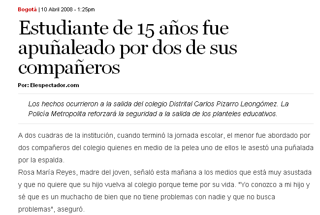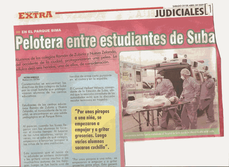 A pesar de los diferentes estudios realizados para contrarrestar esta situación de inseguridad que viven los niños y niñas de la capital en sus recorridos del colegio a la casa y de la casa al colegio, y peor aun de conocer las autoridades cuales son los hechos más visibles que afectan la integridad y protección de los derechos y garantías de los menores, las acciones desarrolladas por las diferentes instituciones públicas tendientes a disminuir su impacto, en vez de aumentar, demuestran un descenso evidenciado en el crecimiento de las situaciones peligrosas en los trayectos realizados por los estudiantes, que corresponden en términos generales a 15 eventos riesgosos determinados como: 1. Delincuencia común. 2. Agresión a estudiantes por parte de sujetos externos. 3. Expendio y consumo de drogas. 4. Pandillas en el entorno. 5. Porte de armas blancas y de fuego. 6. Agresión entre estudiantes. 7. Hurto. 8. Abuso sexual a las afueras del colegio. 9. Venta y consumo de alcohol a menores de 18 años en los entornos. 10. Establecimientos de juego. 11. Zonas de tolerancia en las postrimerías de los colegios. 12. Ventas ambulantes. 13. Amenaza de perros callejeros. 14. Riesgo en vías por falta de señalización, reducidores de velocidad, semaforización y puentes peatonales. 15. Toma de parques por parte de pandillas, delincuencia común y adictos3. Este listado de hechos peligrosos demuestra de forma palmaria que la situación de los caminos a los colegios de los niños y las niñas generan diferentes factores de riesgo, los cuales resultan en gran parte coincidentes con los eventos de inseguridad general que las cifras reportan en la capital. Estos eventos pudieron ser constatados por la Unidad de Apoyo Normativo de mi oficina, quienes efectuaron una investigación para sustentar el debate de Caminos Seguros al colegio realizado el 13 de junio de 2009, en donde luego de tomar una muestra de 58 instituciones educativas públicas del distrito, forma genérica se evidenció que las condiciones de seguridad en los entornos de los colegios no resulta benéfica para los derechos de los menores. Así, son los menores víctimas quienes reportan como constantes en los peligrosos recorridos que efectúan diariamente, la mala señalización, las reiteradas intimidaciones por pandillas a las afueras de los colegios, la ausencia de cruces peatonales seguros, la carencia, en instituciones de educación especial, de sistemas de seguridad vial adecuada a sus necesidades, como por ejemplo, de señales sonoras o táctiles, la ausencia de las autoridades de policía en sectores críticos y en donde existe presencia de la autoridad, esta se realiza por intermedio de policías bachilleres, quienes no pueden responder a las difíciles situaciones a las cuales se ven expuestos los menores. Igualmente, se determina que las instituciones educativas abandonaron las acciones tendientes a realizar mapas para ubicar las zonas críticas, se dejó de trabajar en la sensibilización con la comunidad y en algunos colegios se abandonó por parte de las directivas el esquema y se dejó en manos exclusivas de los orientadores. Entre el año 2008 y 2009, la cifras de accidentalidad aumentaron de 1382 a 1632 y de víctimas fatales pasó de 30 a 37, aunque en el quinquenio se observa una disminución importante en ambos casos.