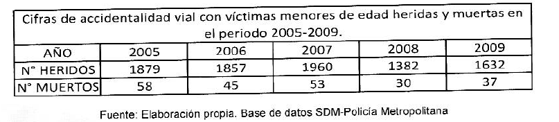 A pesar de los diferentes estudios realizados para contrarrestar esta situación de inseguridad que viven los niños y niñas de la capital en sus recorridos del colegio a la casa y de la casa al colegio, y peor aun de conocer las autoridades cuales son los hechos más visibles que afectan la integridad y protección de los derechos y garantías de los menores, las acciones desarrolladas por las diferentes instituciones públicas tendientes a disminuir su impacto, en vez de aumentar, demuestran un descenso evidenciado en el crecimiento de las situaciones peligrosas en los trayectos realizados por los estudiantes, que corresponden en términos generales a 15 eventos riesgosos determinados como: 1. Delincuencia común. 2. Agresión a estudiantes por parte de sujetos externos. 3. Expendio y consumo de drogas. 4. Pandillas en el entorno. 5. Porte de armas blancas y de fuego. 6. Agresión entre estudiantes. 7. Hurto. 8. Abuso sexual a las afueras del colegio. 9. Venta y consumo de alcohol a menores de 18 años en los entornos. 10. Establecimientos de juego. 11. Zonas de tolerancia en las postrimerías de los colegios. 12. Ventas ambulantes. 13. Amenaza de perros callejeros. 14. Riesgo en vías por falta de señalización, reducidores de velocidad, semaforización y puentes peatonales. 15. Toma de parques por parte de pandillas, delincuencia común y adictos4. Este listado de hechos peligrosos demuestra de forma palmaria que la situación de los caminos a los colegios de los niños y las niñas generan diferentes factores de riesgo, los cuales resultan en gran parte coincidentes con los eventos de inseguridad general que las cifras reportan en la capital. Estos eventos pudieron ser constatados por la Unidad de Apoyo Normativo de mi oficina, quienes efectuaron una investigación para sustentar el debate de Caminos Seguros al colegio realizado el 13 de junio de 2009, en donde luego de tomar una muestra de 58 instituciones educativas públicas del distrito, forma genérica se evidenció que las condiciones de seguridad en los entornos de los colegios no resulta benéfica para los derechos de los menores. Así, son los menores víctimas quienes reportan como constantes en los peligrosos recorridos que efectúan diariamente, la mala señalización, las reiteradas intimidaciones por pandillas a las afueras de los colegios, la ausencia de cruces peatonales seguros, la carencia, en instituciones de educación especial, de sistemas de seguridad vial adecuada a sus necesidades, como por ejemplo, de señales sonoras o táctiles, la ausencia de las autoridades de policía en sectores críticos y en donde existe presencia de la autoridad, esta se realiza por intermedio de policías bachilleres, quienes no pueden responder a las difíciles situaciones a las cuales se ven expuestos los menores. Igualmente, se determina que las instituciones educativas abandonaron las acciones tendientes a realizar mapas para ubicar las zonas críticas, se dejó de trabajar en la sensibilización con la comunidad y en algunos colegios se abandonó por parte de las directivas el esquema y se dejó en manos exclusivas de los orientadores. Entre el año 2008 y 2009, las cifras de accidentalidad aumentaron de 1382 a 1632 y de víctimas fatales pasó de 30 a 37, aunque en el quinquenio se observa una disminución importante en ambos casos.