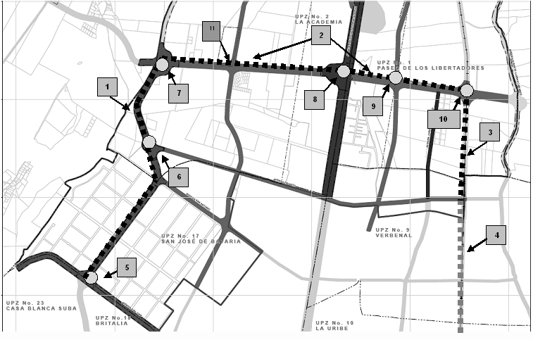 Fuente y cálculos: UAECD- SDH/ Dirección de estadística y estudios fiscales Parágrafo. Los valores que excedan los límites anuales de cobro establecidos en la tabla anterior, y que correspondan al monto asignado a cada predio, serán diferidos a las vigencias fiscales siguientes y serán recaudados por la entidad administradora de la contribución, sin que en ningún evento el cobro supere el término de cinco (5) años, caso en el cual el valor total de la contribución será distribuido proporcionalmente durante dicho término. Artículo 19º Balance. Dentro del año siguiente a la terminación de las obras, plan o conjunto de obras, el Instituto de Desarrollo Urbano (IDU) realizará un balance en donde se consigne la diferencia entre el monto total efectivamente asignado y el costo final de las obras. Artículo 20º Información al Concejo Distrital. A partir de la expedición del presente Acuerdo, la entidad administradora de la contribución y la entidad ejecutora de las obras, en el marco de sus competencias, deberán presentar al Concejo Distrital informes anuales que incluyan los avances de los estudios, diseños e interventorias, la adquisición de predios y su acompañamiento social, la ejecución de obras y el recaudo de la contribución de valorización. Artículo 21º Informe final. Dentro del año siguiente a la terminación de las obras, plan o conjunto de obras, la entidad administradora de la contribución y la entidad ejecutora de las obras presentarán un informe final ante el Concejo Distrital, en el que se señale el costo final de las obras, sus tiempos de ejecución, el recaudo efectivamente realizado, los problemas encontrados en los procesos de cálculo, distribución, liquidación y recaudo del gravamen, y los demás aspectos que resulten relevantes o que sean solicitados por el Concejo. Artículo 22º Vigencia. El presente Acuerdo rige a partir de la fecha de su publicación. PUBLÍQUESE Y CÚMPLASE ANEXO 1 Obras que componen el denominado anillo vial 1 del POZ Norte Estará conformado por tres vías con sus respectivas intersecciones, por un lado, la continuidad de las Avenidas: Laureano Gómez o carrera novena (en el costado oriental) que comprende desde la Avenida San Juan Bosco o calle 170 hasta la AV el Polo o calle 200 y la Boyacá o carrera 72 (en el costado occidental) desde la Av San José hasta llagar a la Avenida El Polo o calle 200. Estas dos avenidas serán conectadas a través de la Avenida El Polo o calle 200 mediante la cual se cierra el circuito vial de este anillo. Se construirán adicionalmente las siguientes intersecciones viales que dan soporte a las tres vías propuestas: Avenida Boyacá por Avenida San José – Solución a desnivel; Avenida Boyacá por Avenida Tibabitá – Solución a nivel; Avenida Boyacá por Avenida El Polo - Solución a desnivel; Avenida El Polo por Avenida Las Villas- solución a nivel; Avenida El Polo por Avenida Paseo de los Libertadores – Solución a desnivel; Avenida El Polo por Avenida Santa Bárbara – Solución a nivel; Avenida El Polo por Avenida Laureano Gómez – Solución a desnivel. Mapa del Anillo Vial 1 y sus intersecciones