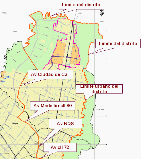 ANEXO 2 Zona de influencia del beneficio La zona de influencia del anillo vial 1 se encuentra definida por el siguiente trazado: desde el sur por la AV calle 72, se acota por occidente por el trazado de la AV NQS hasta la Av calle 80, sobre ésta llega hasta la Av Ciudad de Cali por donde sube hasta encontrase con el humedal de la Conejera y posteriormente con el borde occidental y norte del distrito capital; por su parte el limite oriental en la parte norte lo determina el límite del Distrito incluyendo así el suelo rural y de expansión urbana, y sobre la parte sur oriental el límite urbano del distrito.