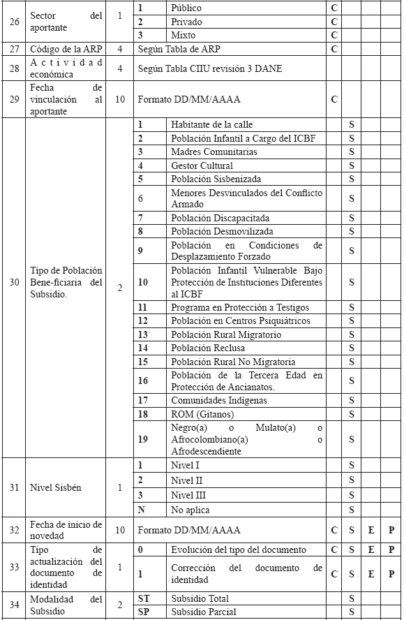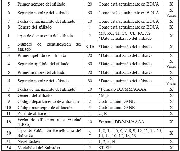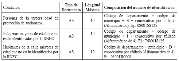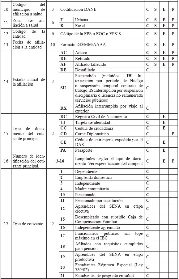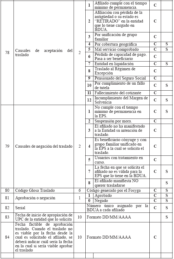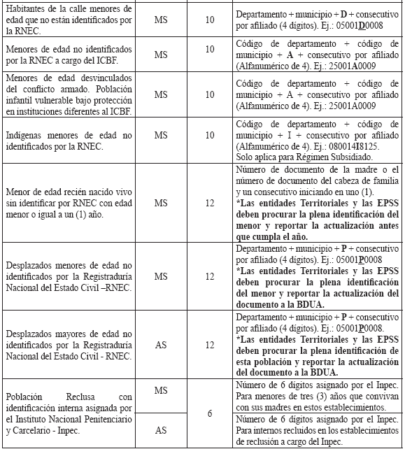 RESOLUCIÓN 004140 DE 2010 (Octubre 15) Derogada por el art. 14, Resolución Min. Protección 2321 de 2011 Por la cual se sustituye el Anexo Técnico de la Resolución 1982 de 2010. NOTA: El Anexo Técnico de que trata la presente Resolución fue modificado parcialmente por la Resolución Min. Protección 721 de 2011. EL MINISTRO DE LA PROTECCIÓN SOCIAL, en uso de sus facultades legales contenidas en los artículos 173 numeral 7 de la Ley 100 de 1993, 42 numeral 42.6 de la Ley 715 de 2001, 5° del Decreto - Ley 1281 de 2002 y 2° numeral 10 del Decreto-ley 205 de 2003, RESUELVE: Artículo 1°. Sustitúyase el Anexo Técnico "BASE DE DATOS ÚNICA DE AFILIADOS– BDUA" de la Resolución 1982 de 2010, el cual hace parte integral de la presente resolución.Artículo 2°. Vigencia. La presente resolución rige a partir de la fecha de su publicación. Dada en Bogotá, D. C., a 15 de octubre de 2010. Publíquese y cúmplase. El Ministro de la Protección Social, MAURICIO SANTAMARÍA SALAMANCA. ANEXO TÉCNICO BASE DE DATOS ÚNICA DE AFILIADOS –BDUA Resolución número 004140 de 2010 (octubre 15) El presente anexo técnico está dividido en 6 partes: 1. Especificaciones para la identificación de los afiliados. 2. Estructura y especificaciones de los archivos, maestros y de novedades que de acuerdo con el régimen deben remitir al Administrador Fiduciario del Fosyga las entidades obligadas a su reporte. 3. Estructura y especificaciones de los archivos de solicitud y autorización de traslado de afiliados en BDUA por parte de las EPS, EOC del Régimen Contributivo. 4. Estructura y especificaciones de los archivos de solicitud y autorización de traslado de afiliados en BDUA por parte de las EPSS del Régimen Subsidiado. 5. Glosario de campos con los valores permitidos y específicos para la información de afiliados y aportantes. 6. Especificaciones técnicas para la remisión de la información. 1. Especificaciones para la identificación de los afiliados Se utilizará para el reporte de identificación de afiliados a la Base de Datos Única de Afiliados la siguiente tabla: TABLA 1. TIPOS Y NÚMERO DE DOCUMENTOS PARA POBLACIÓN ESPECIAL DEL RÉGIMEN SUBSIDIADO Aplica para los afiliados de población especial beneficiaria del subsidio que no están identificados por la Registraduría Nacional del Estado Civil (RNEC).