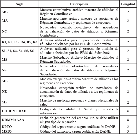 Para las personas identificadas por la Registraduría Nacional del Estado Civil (RNEC), se tendrá en cuenta la identificación asignada vigente, ya sea: Registro Civil de Nacimiento, Tarjeta de Identidad o Cédula de Ciudadanía. Solo se permitirá el uso de tipo y número de identificación para población especial para los especificados en la tabla "1. TIPOS Y NÚMEROS DE DOCUMENTOS PARA POBLACIÓN ESPECIAL". 2. Estructura y especificaciones técnicas de los archivos maestros y de novedades Datos que las entidades deben suministrar al administrador fiduciario del Fosyga para la actualización de la Base de Datos Única de Afiliados. Las Entidades deberán enviar al Administrador Fiduciario del Fosyga, archivos maestros de datos de acuerdo con las estructuras y estándares que a continuación se definen: TABLA 2. SIGLAS PARA NOMBRES DE ARCHIVOS Se han de tener en cuenta las siguientes siglas para los nombres de archivos a remitir por parte de las entidades: