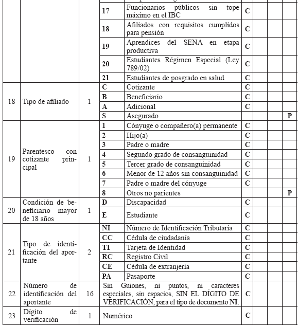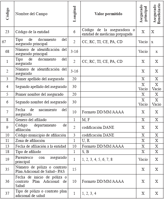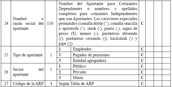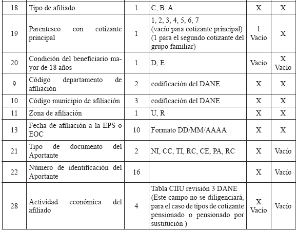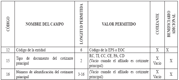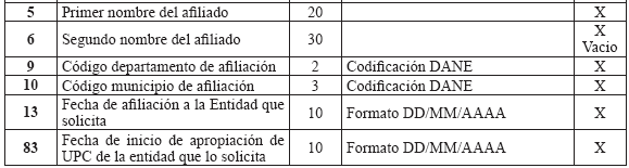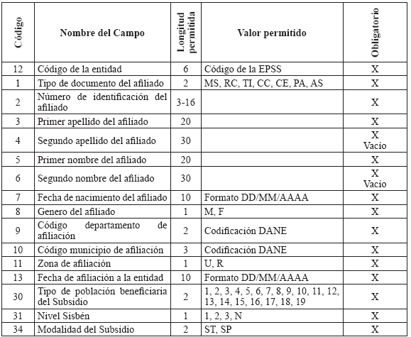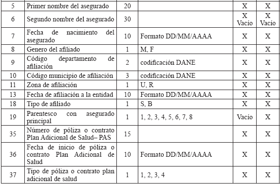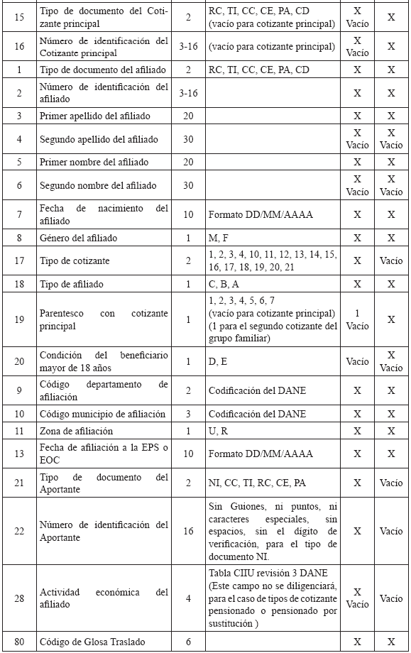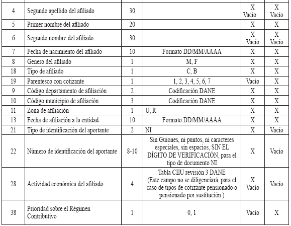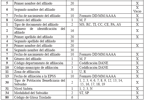 6. Especificaciones técnicas para la remisión de información Medios La información debe presentarse en medio digital. Los siguientes son los formatos técnicos de los medios aceptados: a) Disco Compacto (CD) y/o DVD; b) Transferencia Electrónica. Características del formato Los archivos deben ser tipo texto y cumplir con las siguientes especificaciones técnicas: a) Todos los datos deben ser grabados como texto en archivos planos, con extensión ‘.txt’; b) Los nombres de los archivos y los datos de los mismos deben ser grabados en letras MAYÚSCULAS, SIN CARACTERES ESPECIALES y SIN TILDES (Excepto la Razón Social en el Maestro de Aportantes); c) El separador de campos debe ser coma (,) y ser usado exclusivamente para este fin. Se utiliza el ENTER como fin de registro; d) Cuando el valor de un campo no se encuentre definido dentro de los valores permitidos, este campo no debe llevar ningún valor; es decir, debe ser vacío y reportarse en el archivo plano como (,,); e) Ningún dato en el campo debe venir encerrado entre comillas (") ni ningún otro caracter especial; f) Los campos tipo fecha deben tener el formato DIA/MES/AÑO (DD/MM/AAAA) incluido el caracter SLASH (/) a excepción de las fechas incluidas en los nombres de archivos; g) Los campos numéricos deben venir sin ningún formato de valor ni separación de miles ni decimales; h) Se debe tener especial cuidado con las longitudes del número de identificación de los afiliados según el tipo de documento; i) Los valores registrados en los archivos planos no deben tener ninguna justificación; por lo tanto, no se les debe completar con ceros ni espacios, especialmente en los campos número de identificación, apellidos y nombres; j) Tener en cuenta que los datos que contengan CEROS, estos no pueden ser reemplazados por la vocal ‘O’ la cual es un caracter diferente a cero y viceversa; k) Los archivos planos no deben traer ningún caracter especial de fin de archivo ni de final de registro. NOTA: Publicado en el Diario Oficial 47870 de octubre 22 de 2010 |