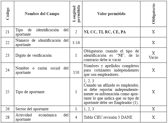 Si un afiliado tiene más de un aportante, la entidad debe reportar solo un registro por cualquiera de los aportantes y las demás relaciones las debe reportar en el archivo de Novedades de Actualización (NC). Si un cotizante es independiente, él es su propio aportante; debe reportarse su tipo y número de identificación en los campos "Tipo de identificación del aportante" y "Número de identificación del aportante" en el archivo maestro de afiliados. TABLA 5. ESTRUCTURA DEL ARCHIVO MAESTRO DE APORTANTES