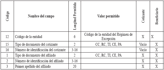 2.2.3. Regímenes de Excepción Aplica para Ecopetrol, el Fondo Prestacional del Magisterio y Universidades con servicio de salud. TABLA 7. ESTRUCTURA DEL ARCHIVO MAESTRO DE AFILIADOS A LOS REGÍMENES DE EXCEPCIÓN