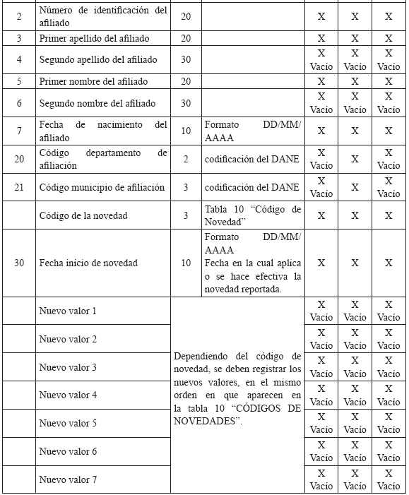 TABLA 10. CÓDIGOS DE NOVEDADES Se deben diligenciar todos los campos en el orden establecido por esta tabla, estas novedades aplican para afiliados registrados en la BDUA.